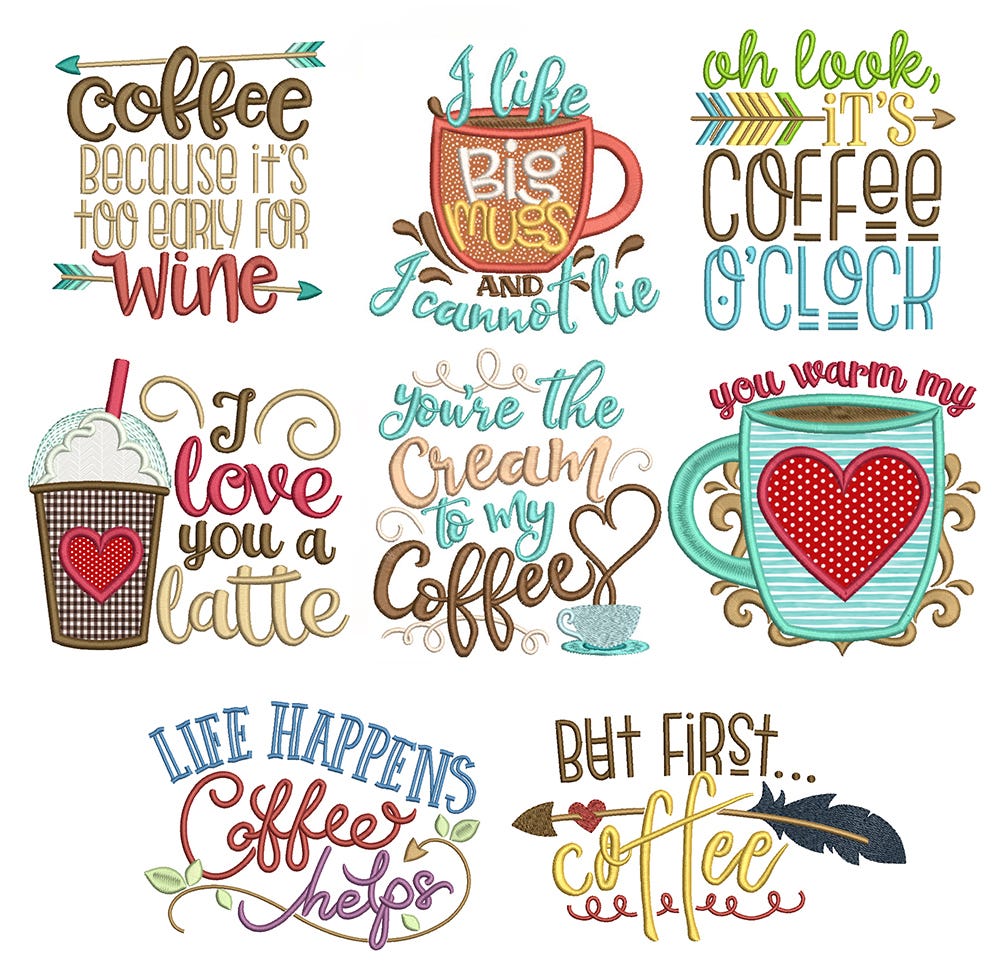 *Please note that the following designs contain applique components: I like big mugs and I cannot lie / I love you a latte / you warm my heart. The remaining designs are embroidery only.