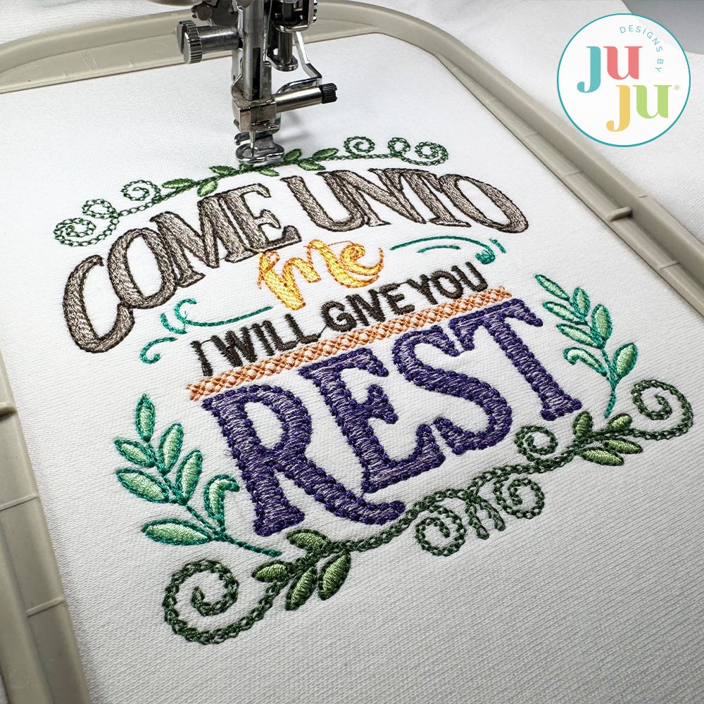 "Come unto me. I will give you rest." This beautiful, biblical word art design is a lovely choice for stitching thoughtful gifts, spiritual keepsakes, or peaceful accents for your space.