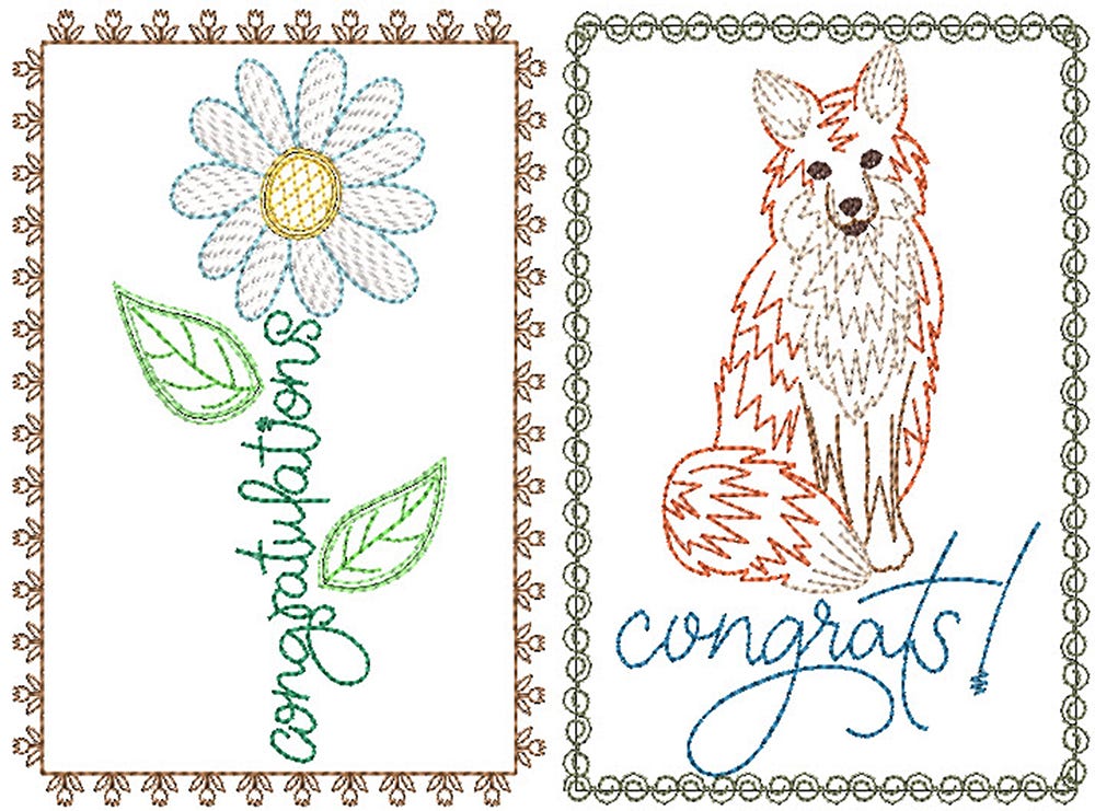 5x7 will fit on a 5x7 card withĀ approximatelyĀ 1/4-1/2 inch margin all the way around. I like to stitch my design onto Watercolor Paper, and then trim it out and mount it onto a contrasting colored cardstock.