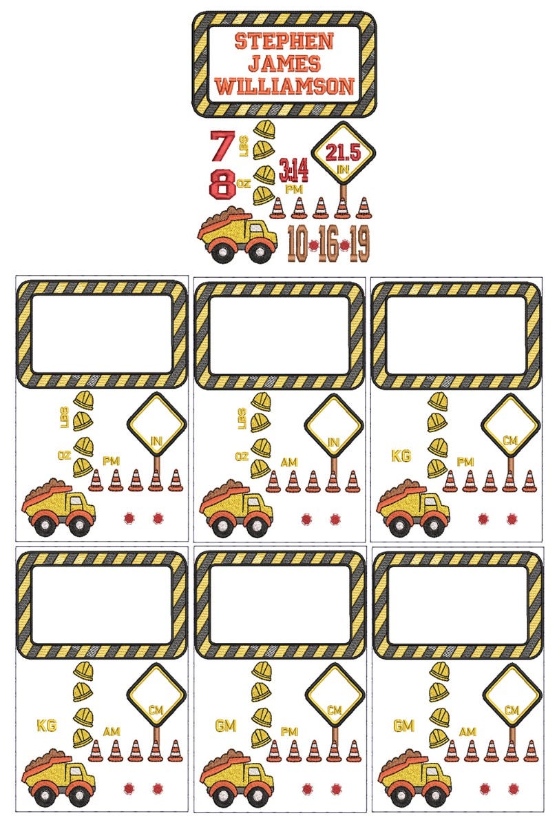 You will receive the embroidery templates shown. Customize with your own names, date, weight and length with fonts from your purchased collection or those that are built in to your embroidery software.Ā I have included a "basting" stitch as the first step so that while you are customizing in your software, you can ensure to stay with the parameters of your hoop. Skip the first step upon stitching.