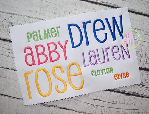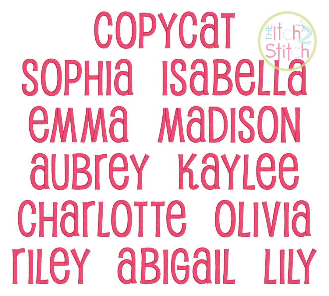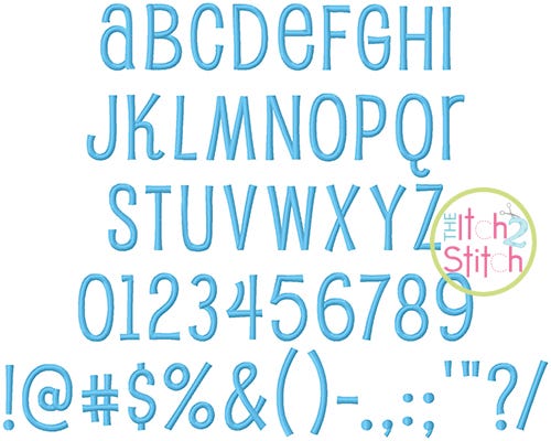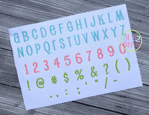 You will receive all A-Z letters, numbers and partial punctuation (53 files) in six sizes. Please note this is a "unicase" font. There is only one design file for each letter of the alphabet. It is a mix of traditional capital and lowercase letters, as pictured. The dots on the punctuation symbols for the 2.5" and 3" sizes feature split satin stitch, but all the lettering for all sizes is completely satin stitch.