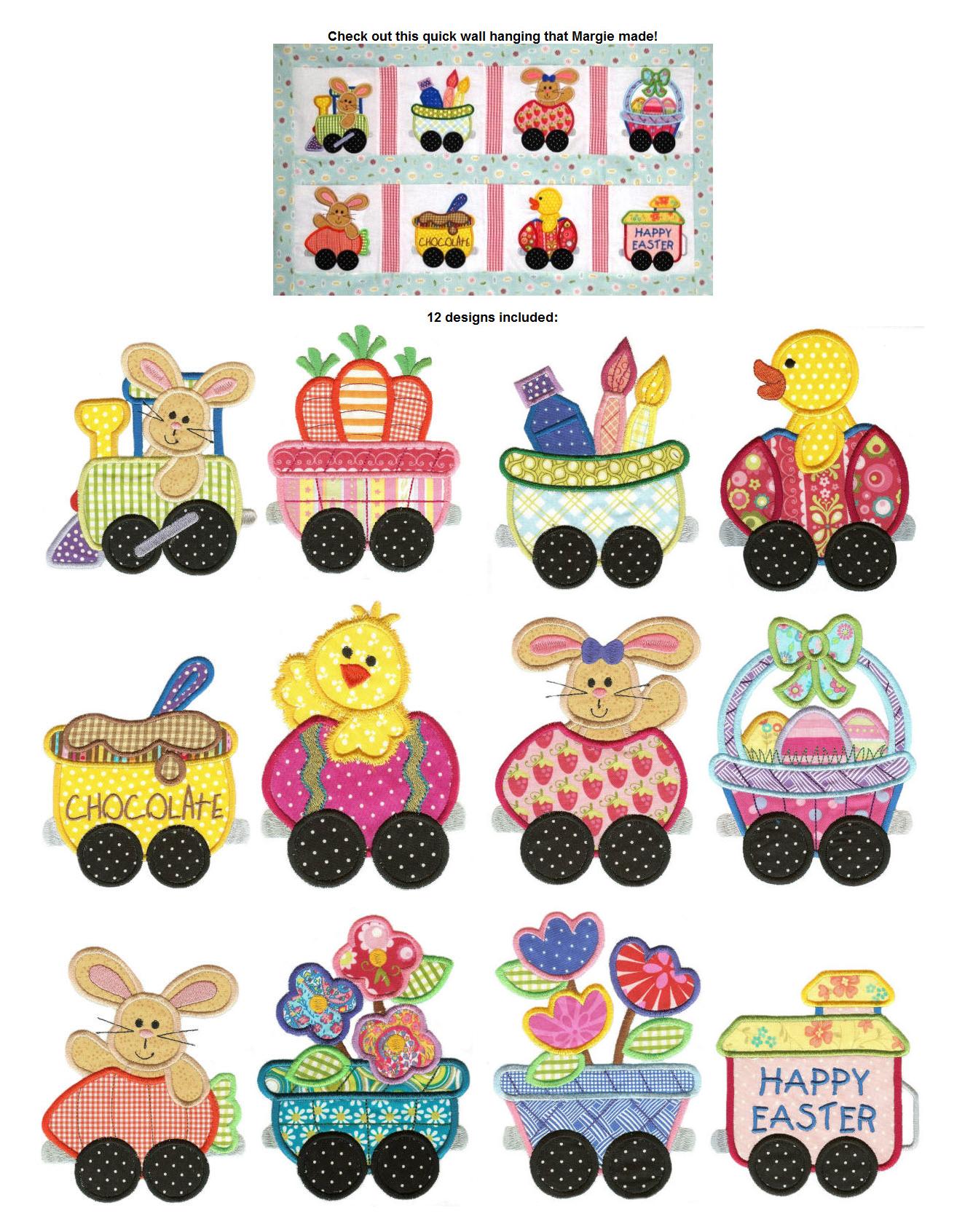 All aboard the Cottontail Express with this darling Easter Bunny choo choo train in applique. All cars are proportionate to each other to make for the sweetest choo choo!