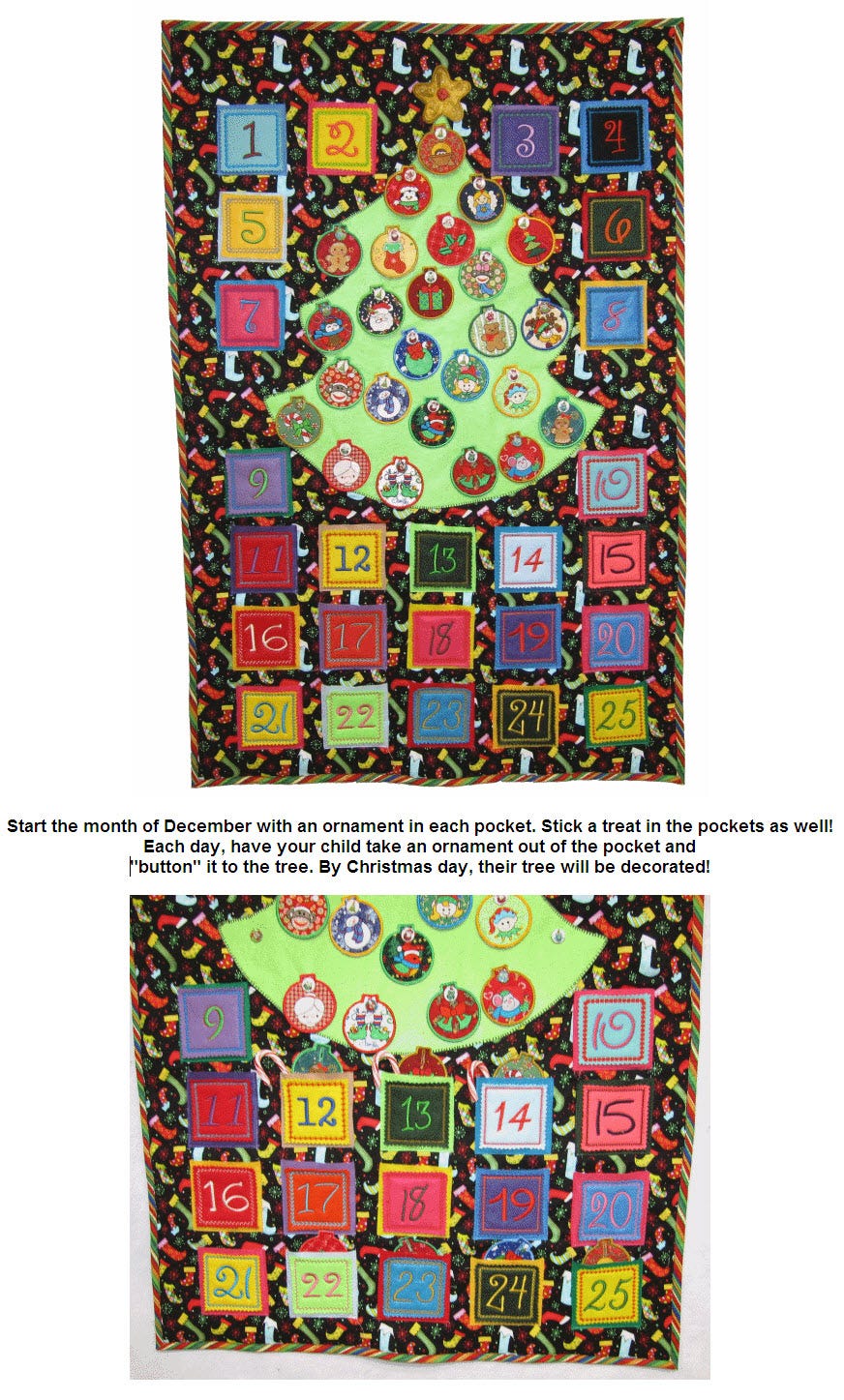 Each day your child will take an ornament out of the pocket and "button" it onto the Christmas tree. On Christmas day, your tree will be decorated! Have fun!!