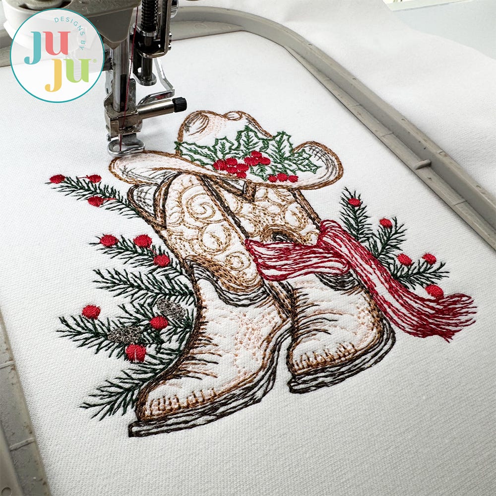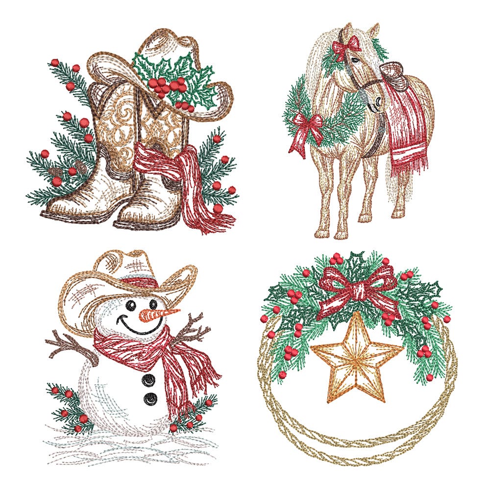Bring a little country charm to your Christmas stitching! Our Country Western Christmas embroidery design set features four adorable western-themed holiday designs, perfect for adding a festive, rustic touch to your décor, gifts, and more.