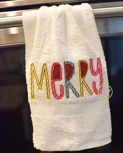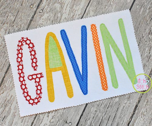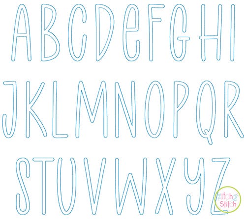 This is a bean stitch applique set. Each letter has placement and tack down stitches, then is finished off with a triple bean stitch. When trimming the letters, leaving a quarter-inch seam allowance allows for fraying and a raggy look. Trimming close to the line will give a more polished look - depending on your material you may wish to use a fusible product like Heat N Bond Lite to prevent fraying. Letters with a hole (A, B, D, E, O, P, Q and R) allow for a second fabric to be placed on the hole.