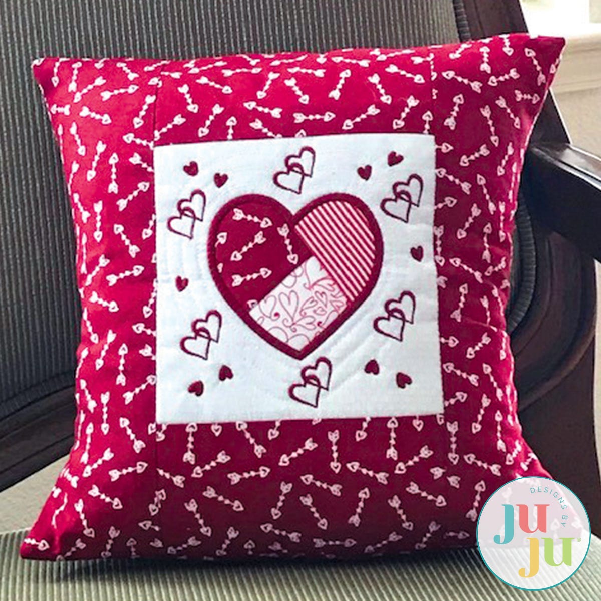 This small applique heart pillow is made as a partial in the hoop project. The background is shadow quilted in a heart motif and the center heart is appliqued. The top and bottom borders are applied during the embroidery. The two long side borders and back of the pillow get attached on the sewing machine. The envelope style pillow back is constructed using a very easy, no sew technique. Detailed instructions with many photos are included with your download.