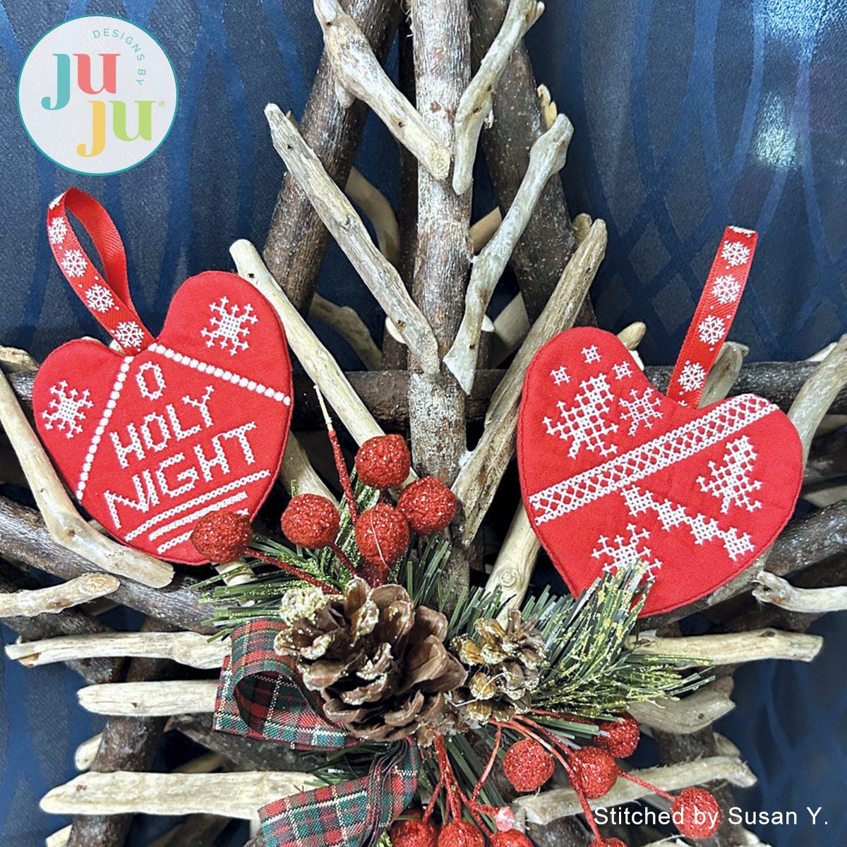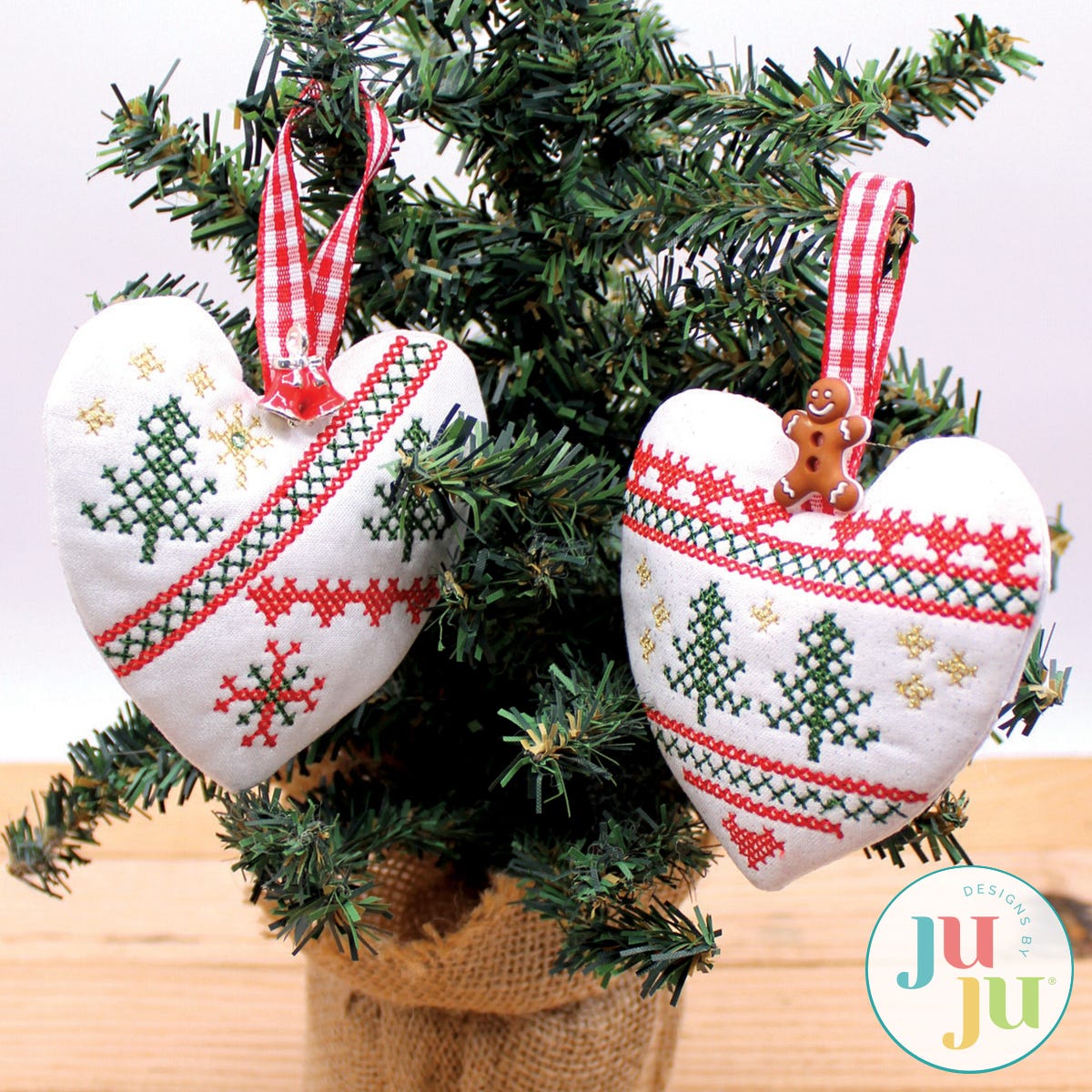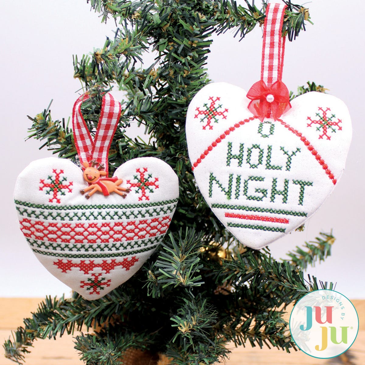 These 3D cross stitch hearts are fast to stitch and make a great hostess gift. They look attractive on your Christmas tree but also as add ons to your gift packages. The ornaments are completely stitched in the hoop. There is no other sewing machine or hand stitching required. Embellish them with bows, buttons, crystals to your heart’s content! Sew much fun.