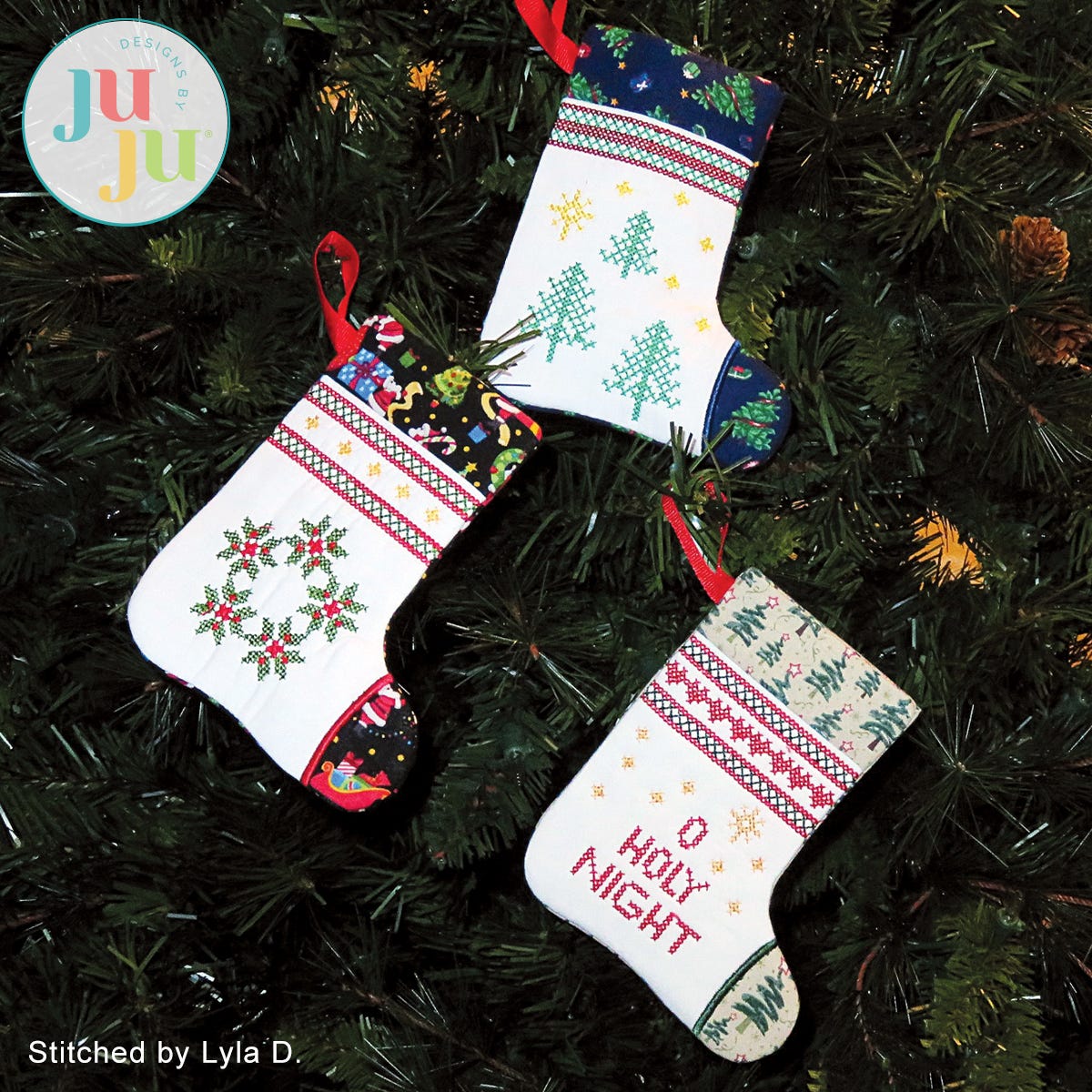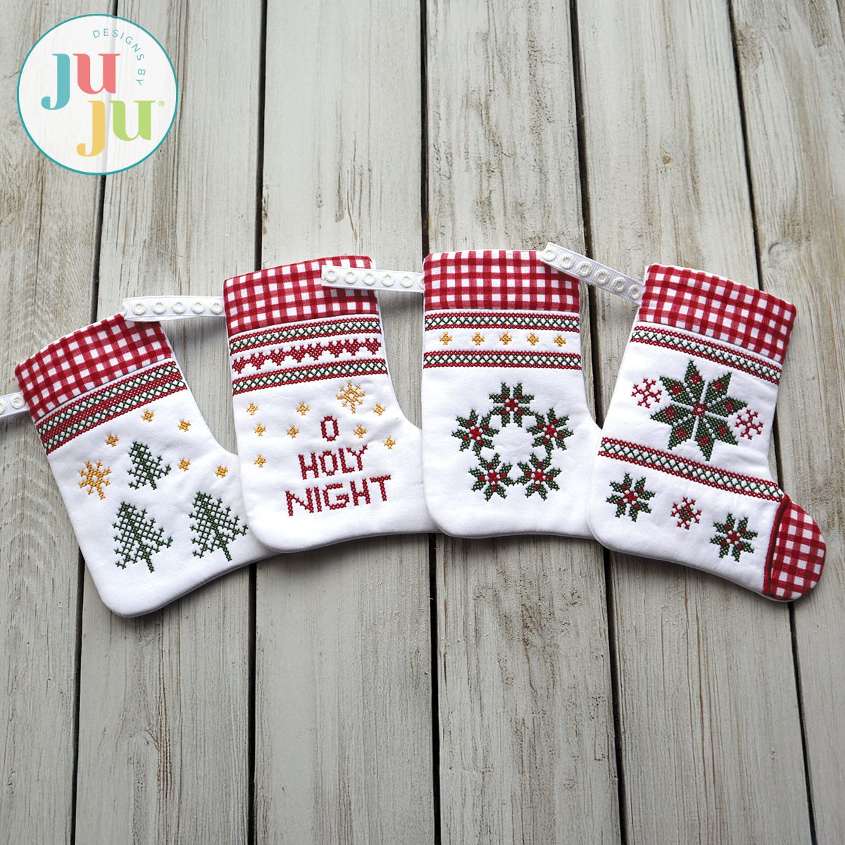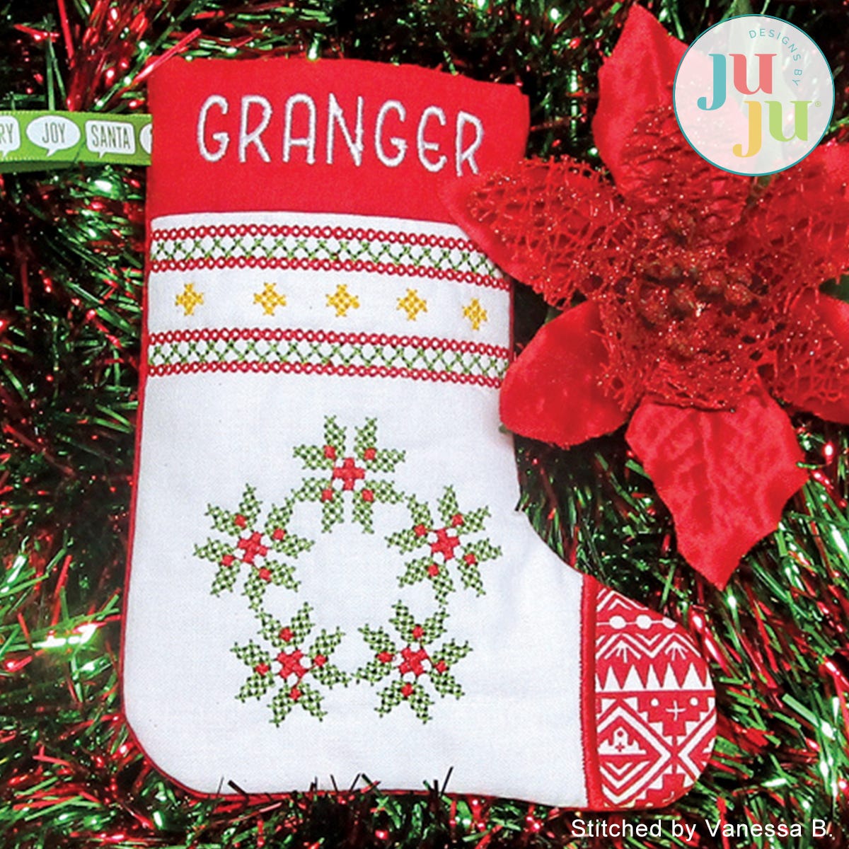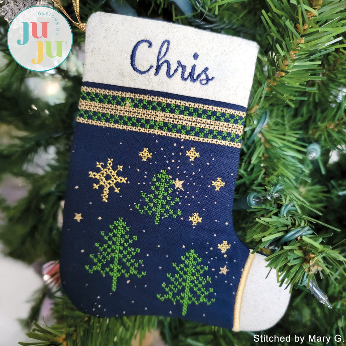 There are a total of 5 stitch files in this download. 4 with a cross stitch motif and 1 plain one that you can use to showcase Christmas fabrics. You can hang this little stocking from your Christmas tree. It can also be used as a place card for your Christmas dinner table. Only one hooping is required.