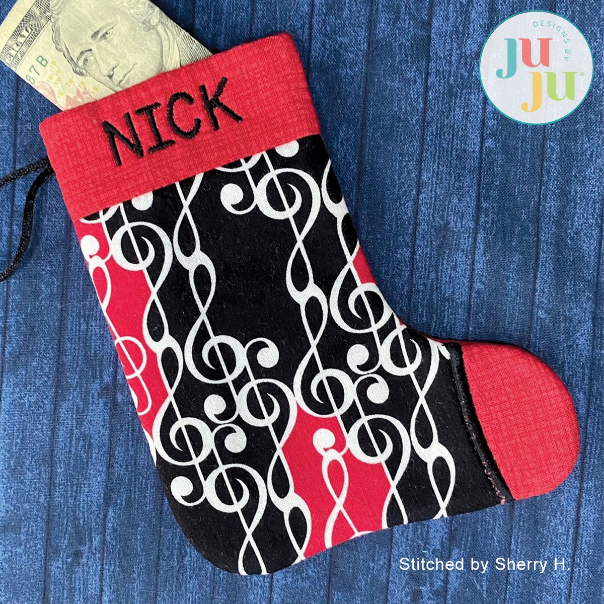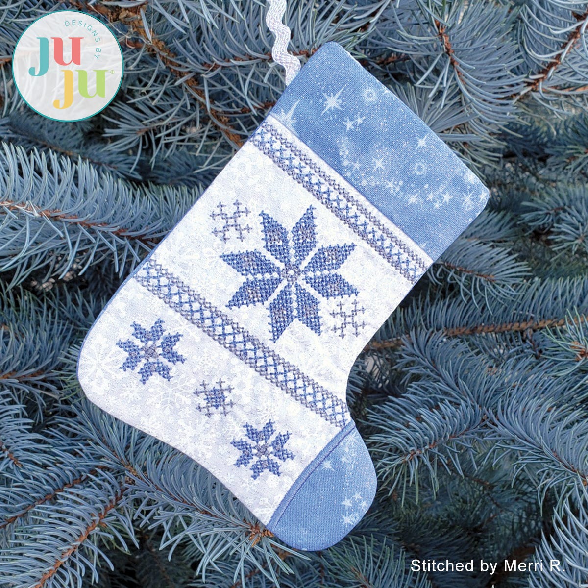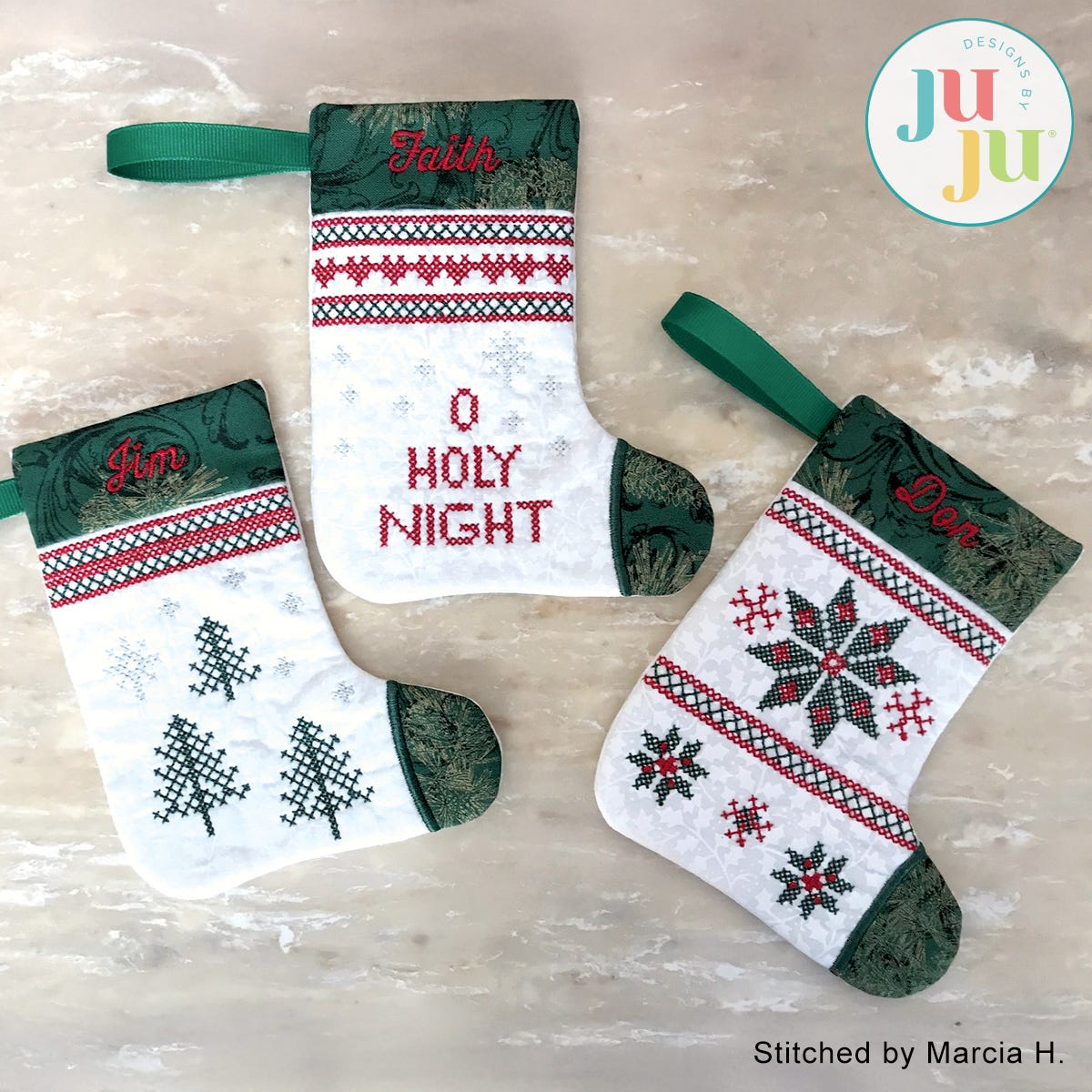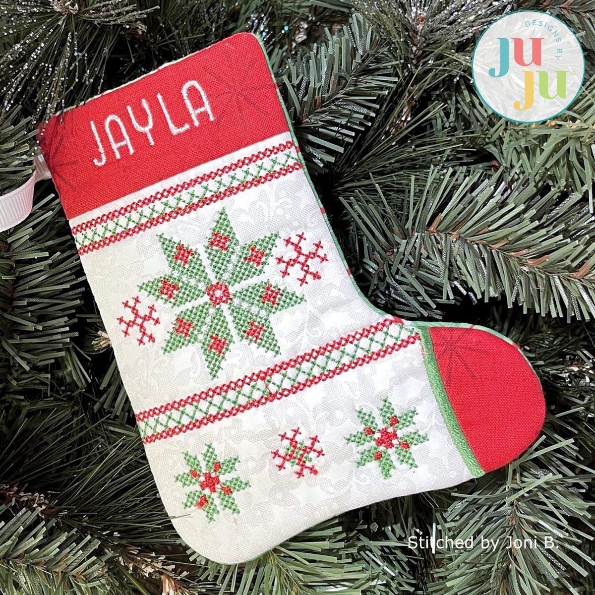 There are a total of 5 stitch files in this download. 4 with a cross stitch motif and 1 plain one that you can use to showcase Christmas fabrics. You can hang this little stocking from your Christmas tree. It can also be used as a place card for your Christmas dinner table. Only one hooping is required.