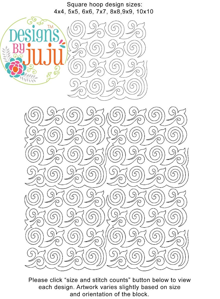 Please note: Both the scale of each pattern and arrangement of the motifs may vary based on the hoop size. Please click the "Size and Stitch Count" button to view the artwork for each size.