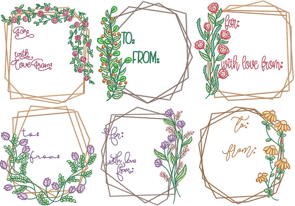 6 beautiful and elegant customizable quilt labels! These designs are embroidery-only featuring a mix of bean stitch, zigzag stitch and satin stitch details.