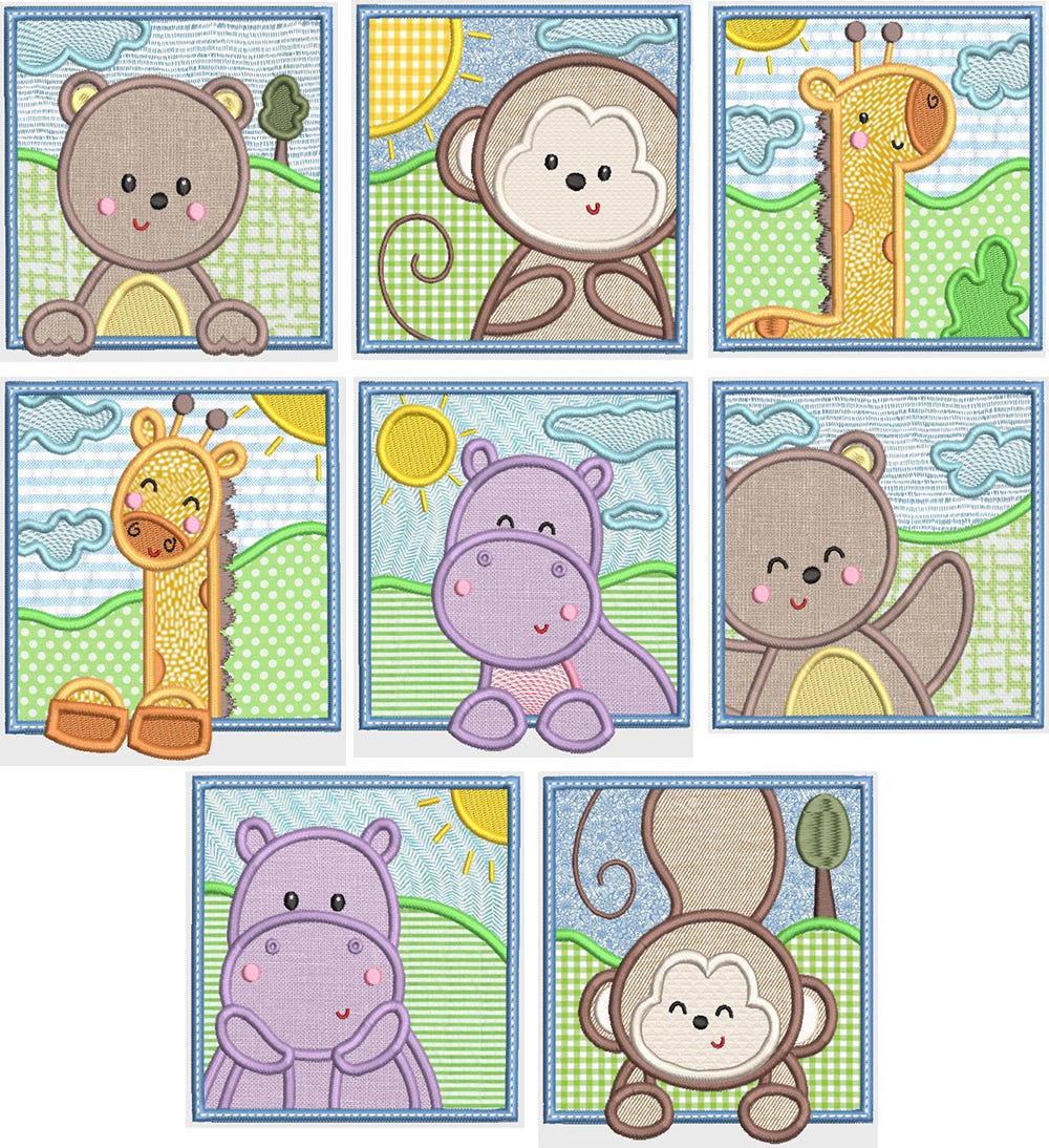 8 adorable animal square designs in applique!