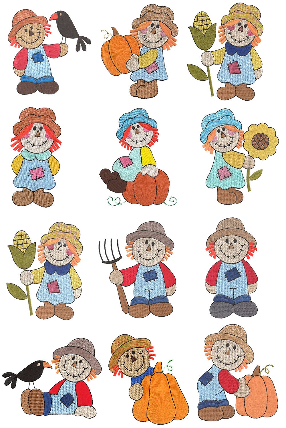 12 super sweet scarecrows in filled stitch. Perfect for your autumn projects! Also available in applique here.