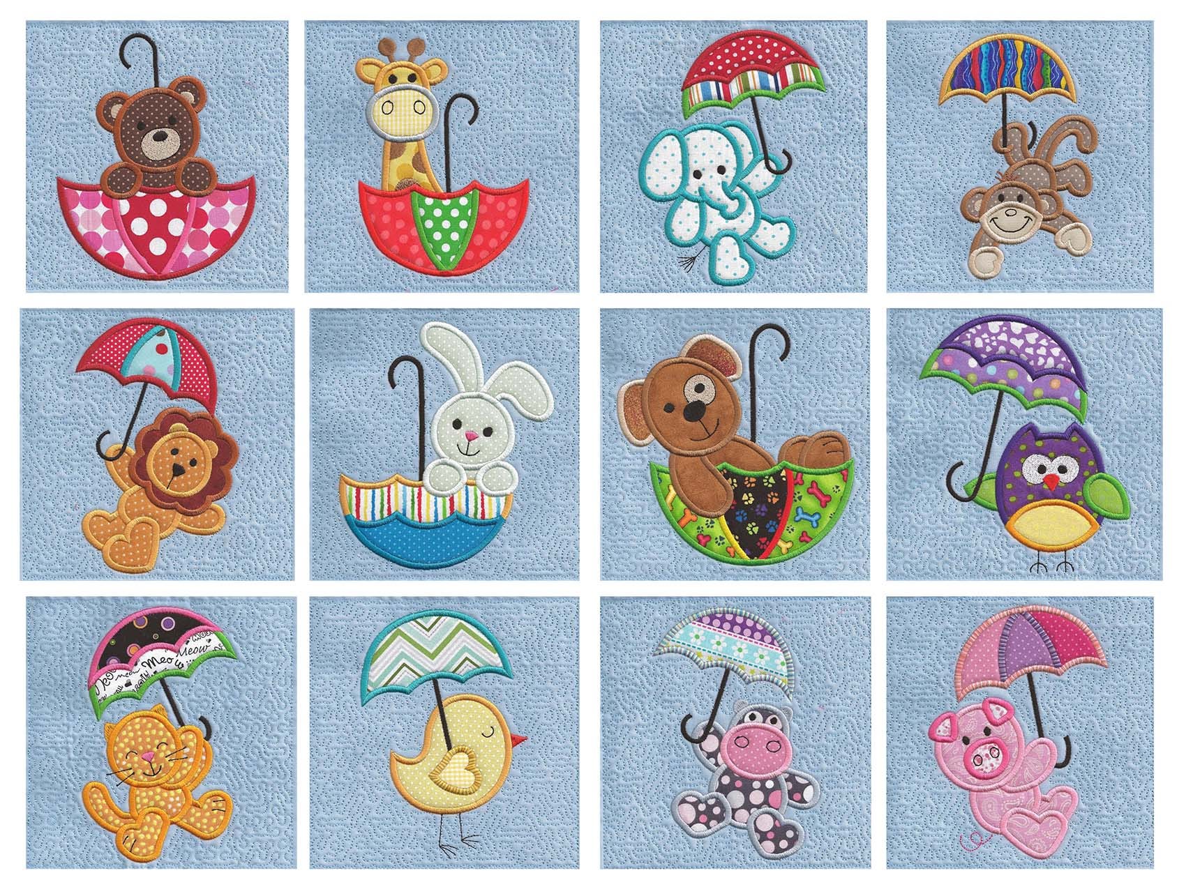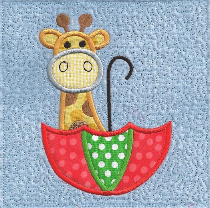 12 seriously cute baby animals with umbrellas in applique. This set is a great value with 3 different sizes per critter of *just* applique, and 4 quilt block sizes each with stippling background. A wonderfully versatile set!