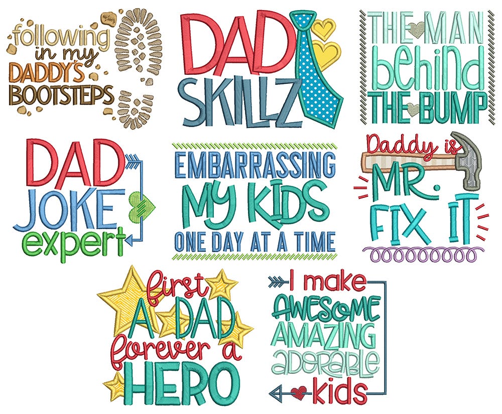 *Please note that the following designs contain applique components: Dad Skillz / Daddy is Mr. Fix it / First a dad forever a hero /
