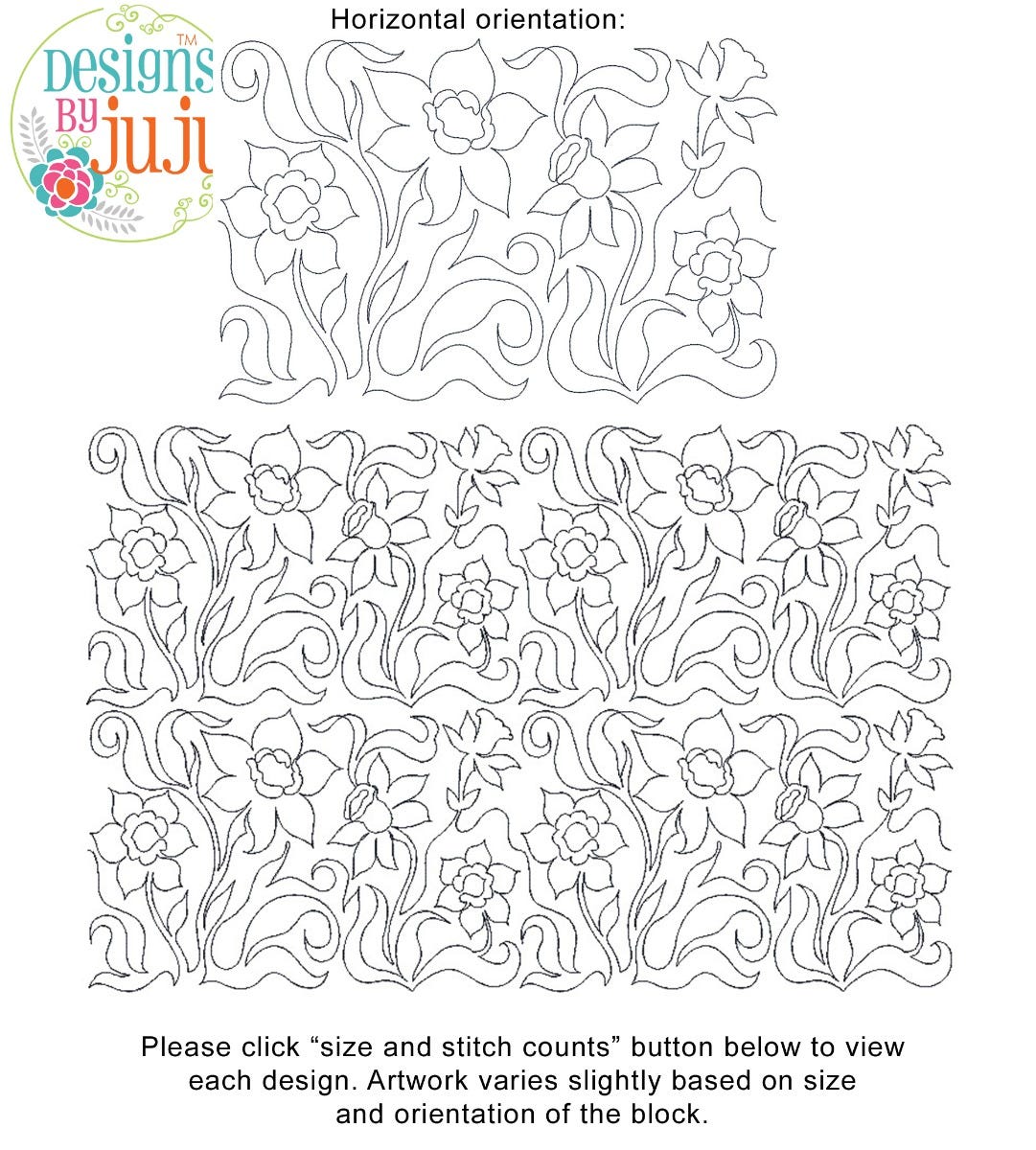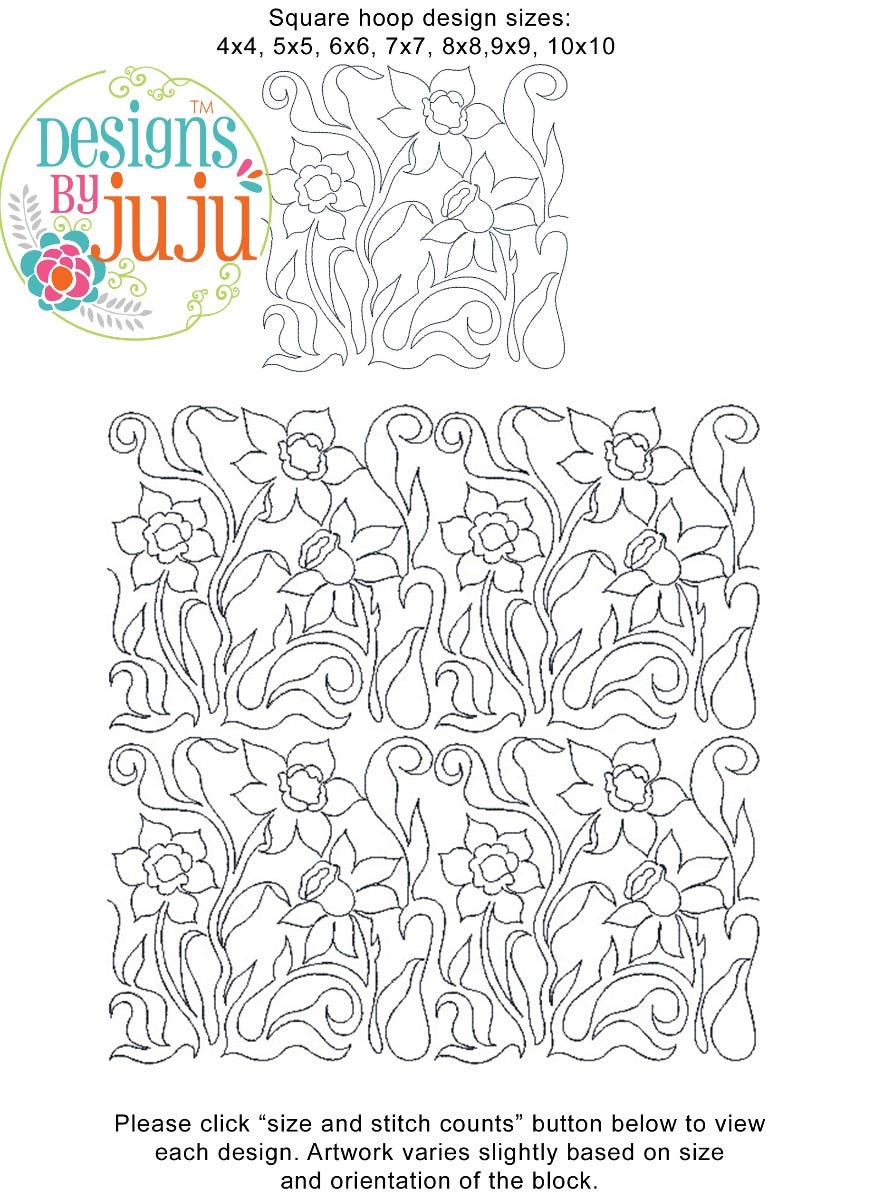 Please note: Both the scale of each pattern and arrangement of the motifs may vary based on the hoop size. Please click the "Size and Stitch Count" button to view the artwork for each size.