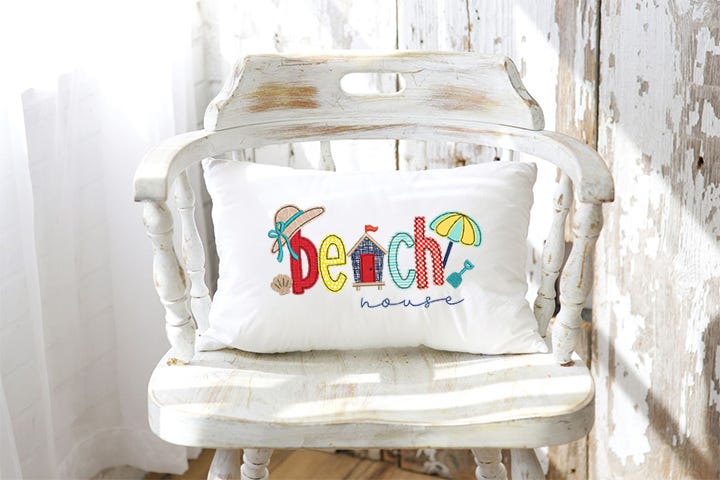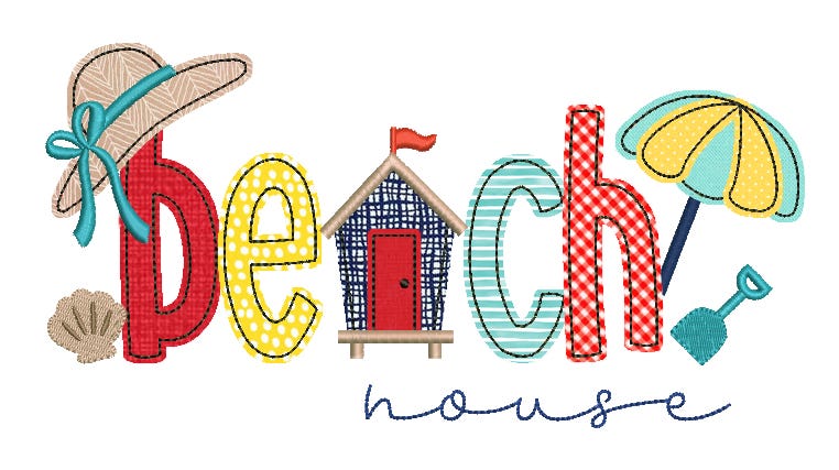 "Beach House" features designs from our Beach Alphabet Embellishment Kit with Best Friend Forever Script Bean Embroidery Font