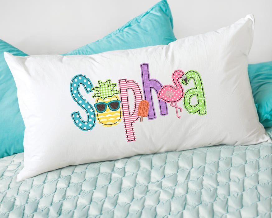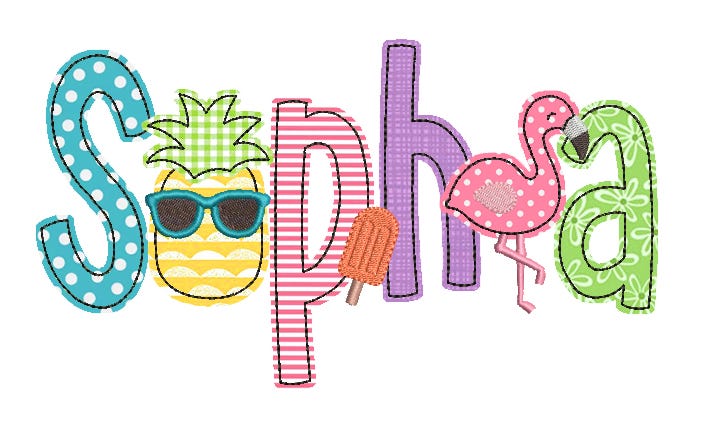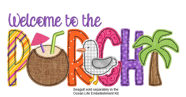 "Welcome to the Porch" features designs from our Tropical and Ocean Life Alphabet Embellishment Kits with Boquete Embroidery Font