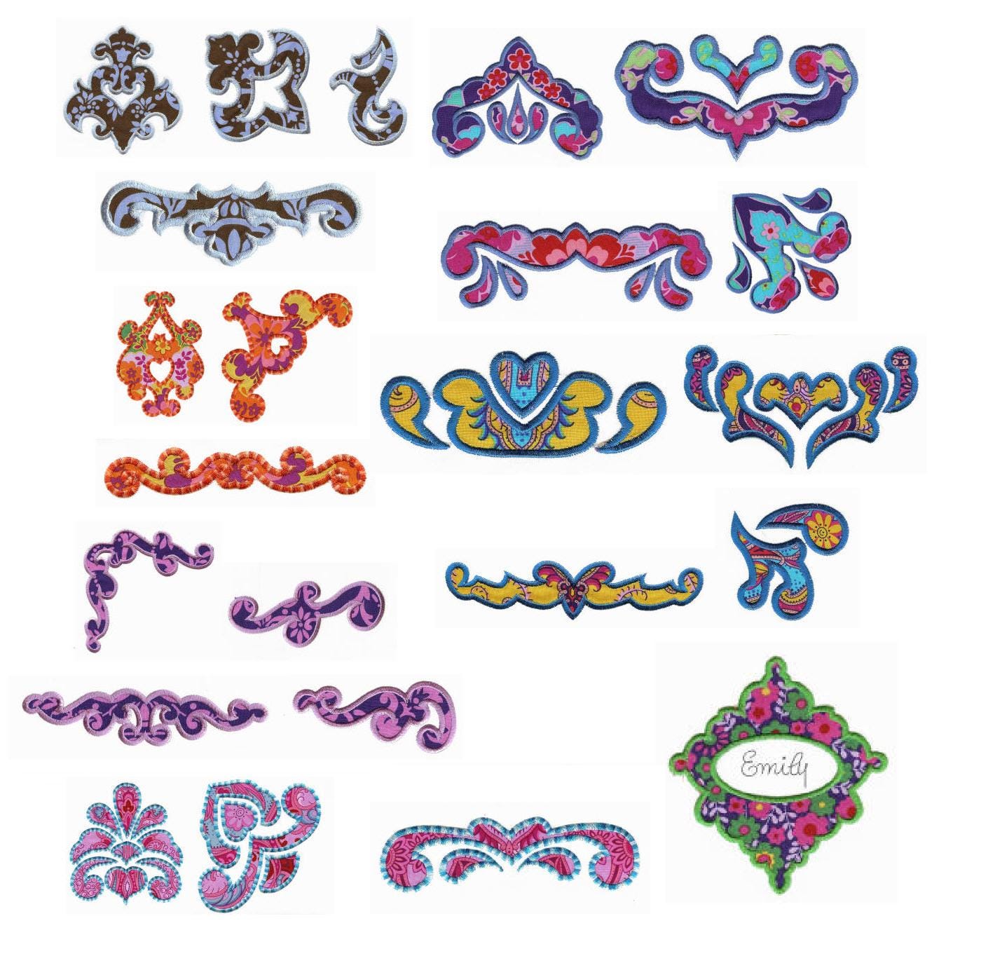 A huge set of 23 damask style elements in applique for the 5x7 hoop. Elegant and great for a wide variety of projects. Great for quilters!