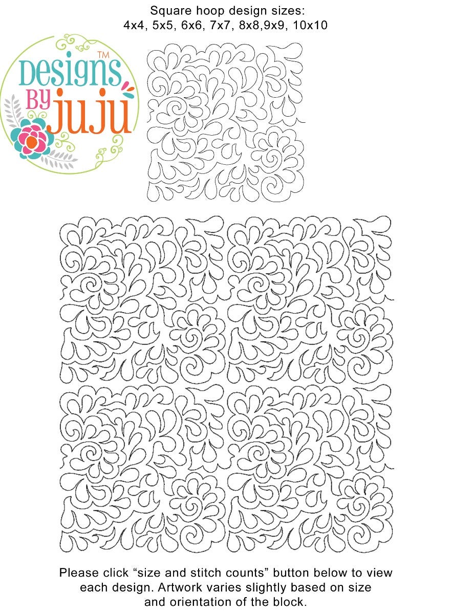 Please note: Both the scale of each pattern and arrangement of the motifs may vary based on the hoop size. Please click the "Size and Stitch Count" button to view the artwork for each size.