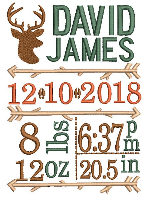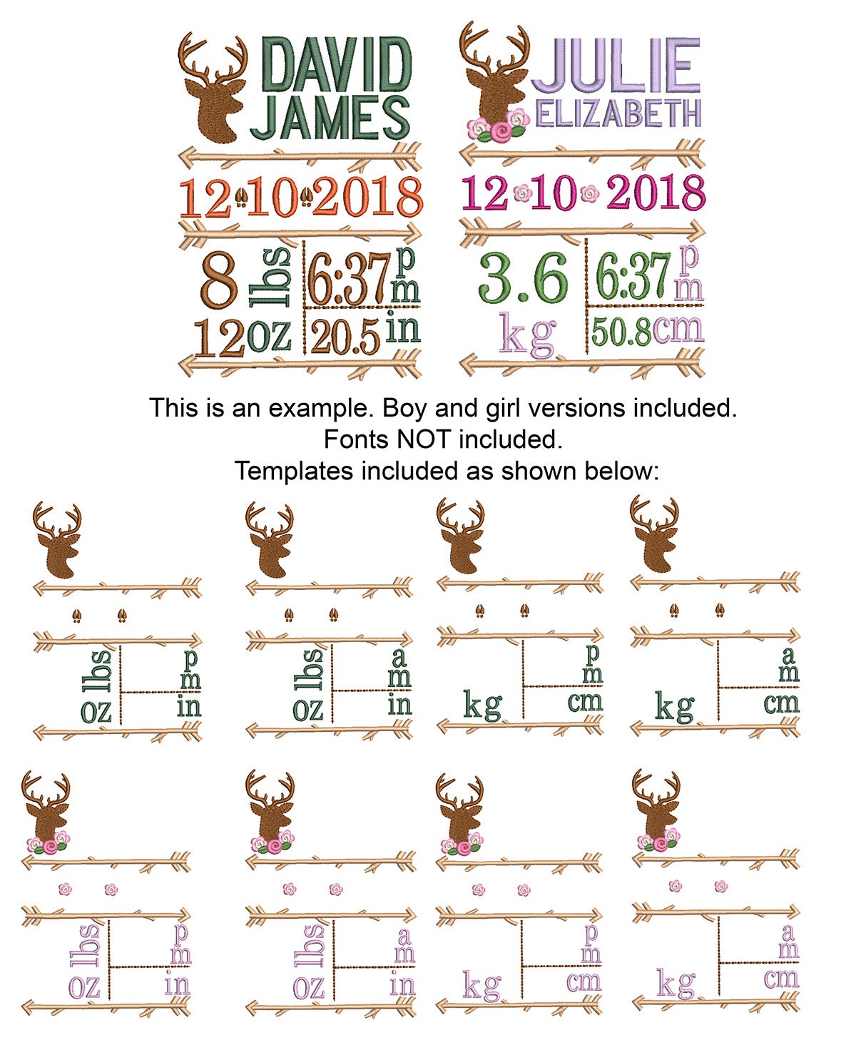 You will receive the embroidery templates shown. Customize with your own names, date, weight and length with fonts from your purchased collection or those that are built in to your embroidery software.Ā I have included a "basting" stitch as the first step so that while you are customizing in your software, you can ensure to stay with the parameters of your hoop. Skip the first step upon stitching.