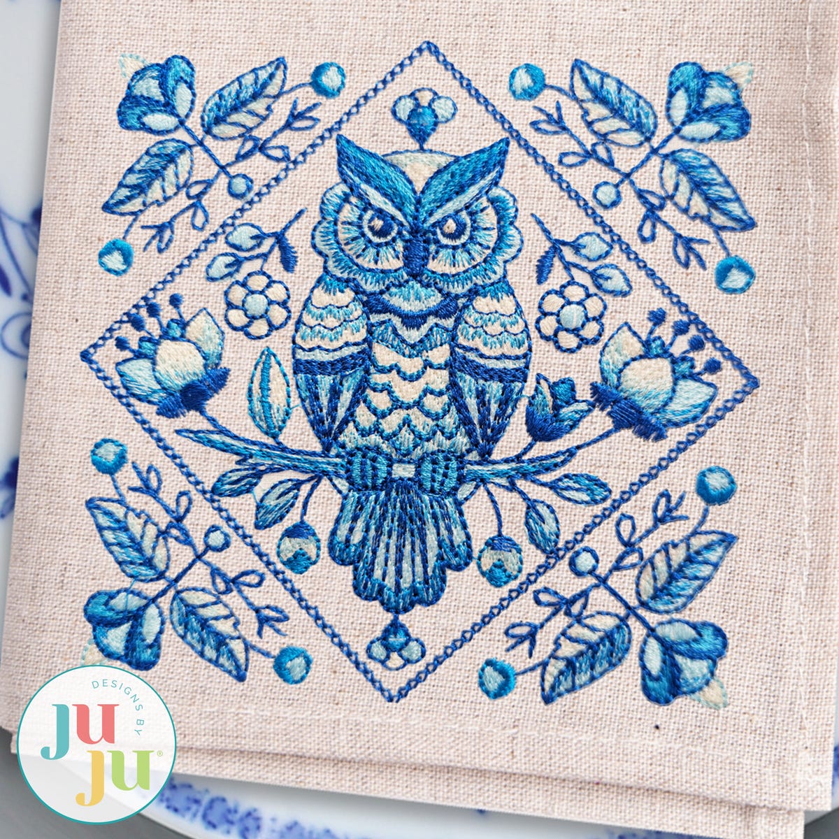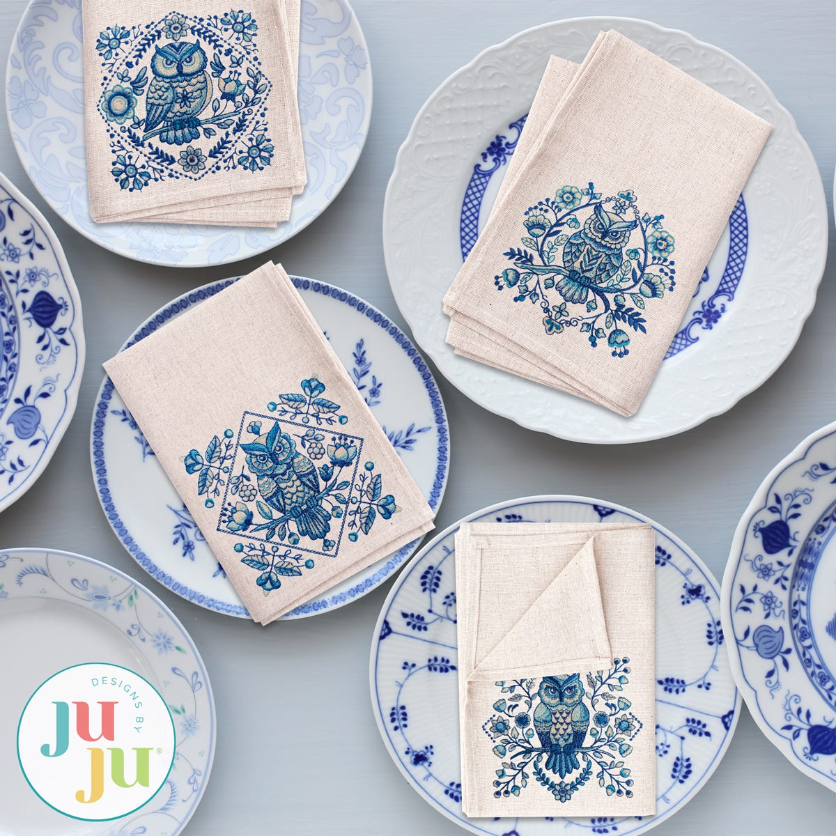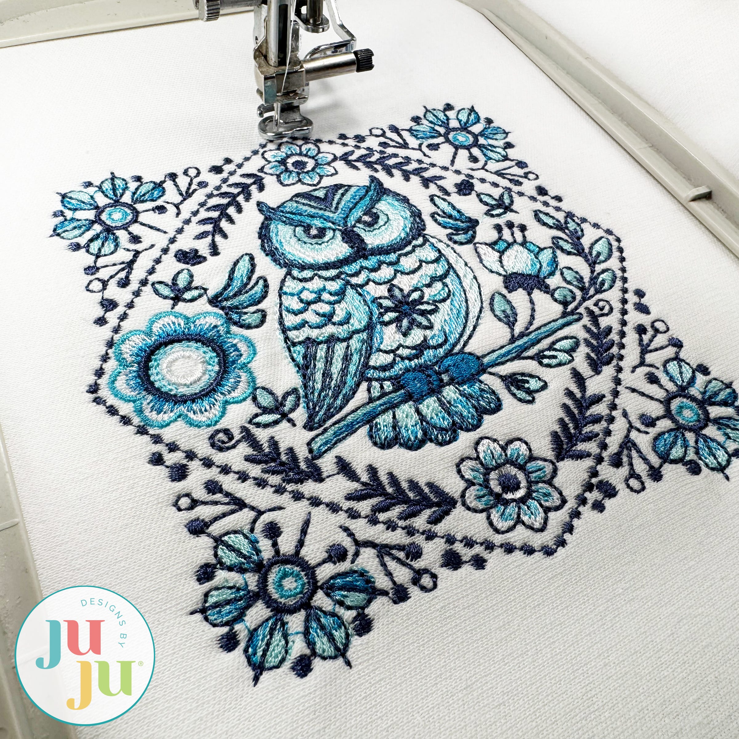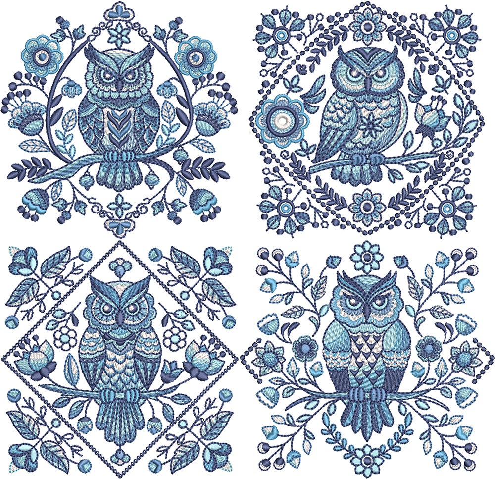 Four beautiful floral owl designs featuring a blend of sketch and satin fills with bean stitch outlines.