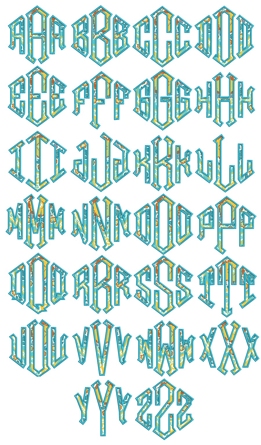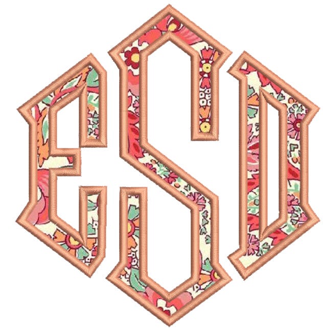 Diamond Applique Monogram is a wonderful classic three letter monogram that is comprised of left, center and right letters per size offered. When combined, the final monogram will form a diamond shape.