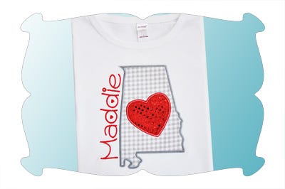 Let's show some love for the great state of Alabama! Featuring a state of Alabama outline applique with a heart!
