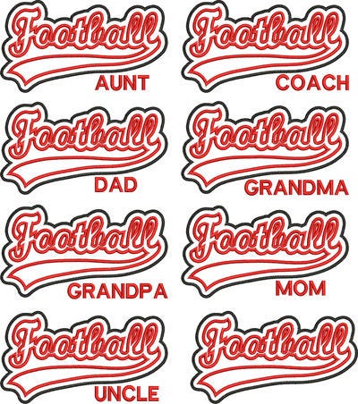 The Football Double Applique comes in 3 sizes (5x7, 6x10, 7x12) and 8 different designs: AUNT, COACH, DAD, GRANDMA, GRANDPA, MOM, UNCLE and a blank design for you to personalize with a name/font of your choice. All sizes included with your purchase!