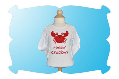 Lil Crab comes as is available as crab applique only and also the crab applique combined with the words "feelin' crabby?" in sizes 5x7 and 6x10. In size 4x4 the words are in a separate design file.