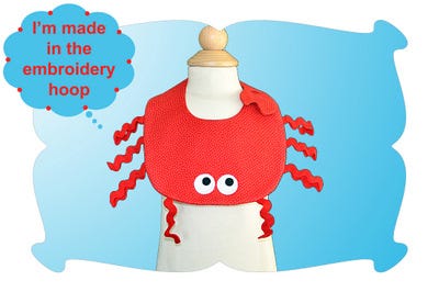 The bib is made in the hoop and features a "crab claw" side snap closure and rick rack "claws".