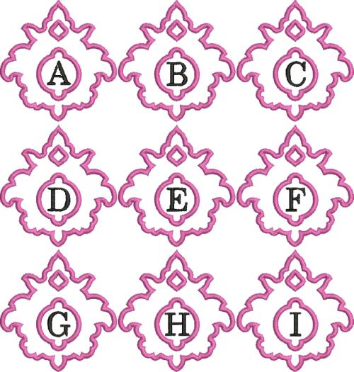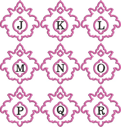 The modern monogrammed damask applique comes in 5 sizes and 2 finishing options: Satin and Zig Zag stitch!