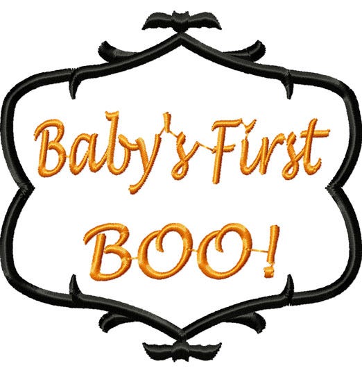 You receive a blank design so you can personalize the applique frame or add your own monogram font to it as well as applique frames with the words "Baby's first BOO!" and "BOO!".