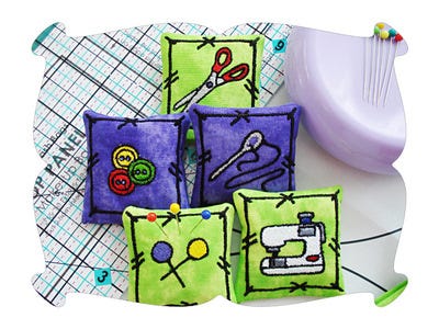 The Pattern Weight Set includes: 5 Pattern Weights: Sewing Machine, Pins, Scissors, Needle and Thread and Buttons.