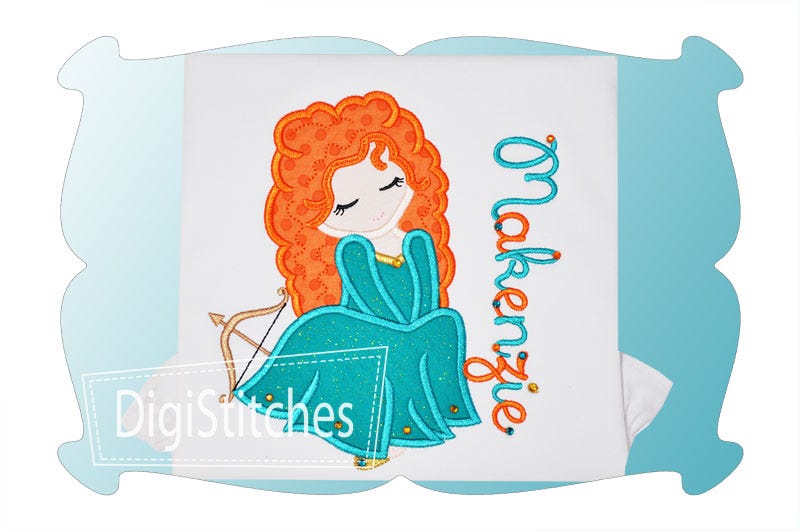 Pretty Princess 5 applique. Featuring curly hair and a bow and arrow, this cutie is dreaming of her prince!