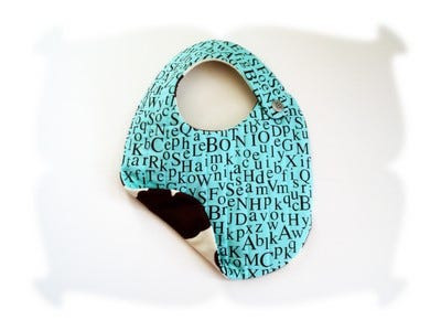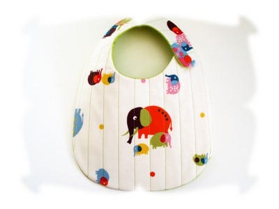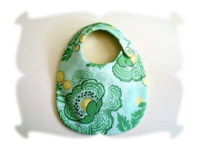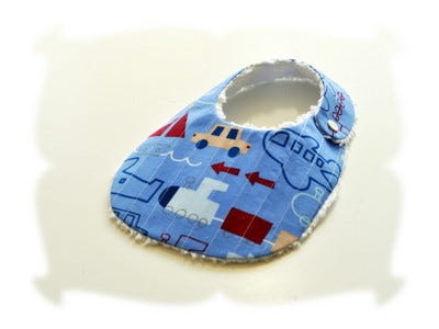 8x12 Bib Sizing: Finished bib measures approximately 7.5 inches wide by 11.25 inches long, with a neck opening of 12.5 inches. Recommended for babies up to 12 months of age, although messy babies may prefer a bib with more coverage.