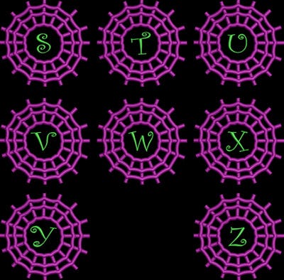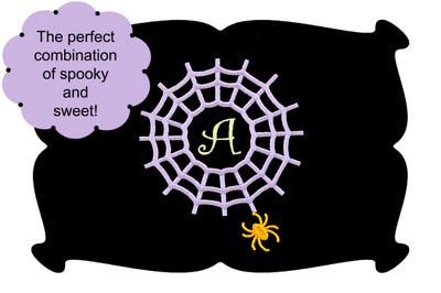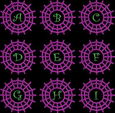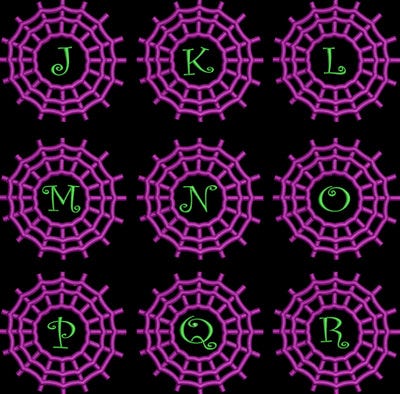 Spider Web Monogram, capital letters A thru Z, in 4 sizes: 3x3 (perfect for doll clothes and small Onesies), 4x4, 5x7 and 6x10. Please note: The 3x3 and 4x4 size designs have the spider web monogram with no spider. The 5x7 and 6x10 designs have the design with the spider embedded onto it for you.
