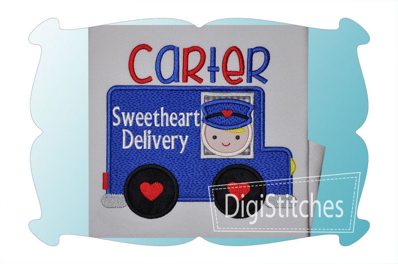 A cute mail truck applique delivering a Valentine to your sweetheart.