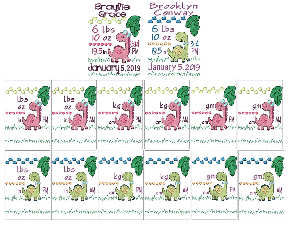 You will receive the embroidery templates shown. Customize with your own names, date, weight and length with fonts from your purchased collection or those that are built in to your embroidery software.Ā I have included a "basting" stitch as the first step so that while you are customizing in your software, you can ensure to stay with the parameters of your hoop. Skip the first step upon stitching.