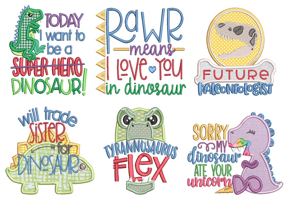 *Please note that the following designs contain applique components:Ā Today I want to be a dinosaur / Future Paleontologist / Will trade sister for dinosaur / Tyrannosaurus Flex / Sorry my dinosaur ate your unicorn /Ā