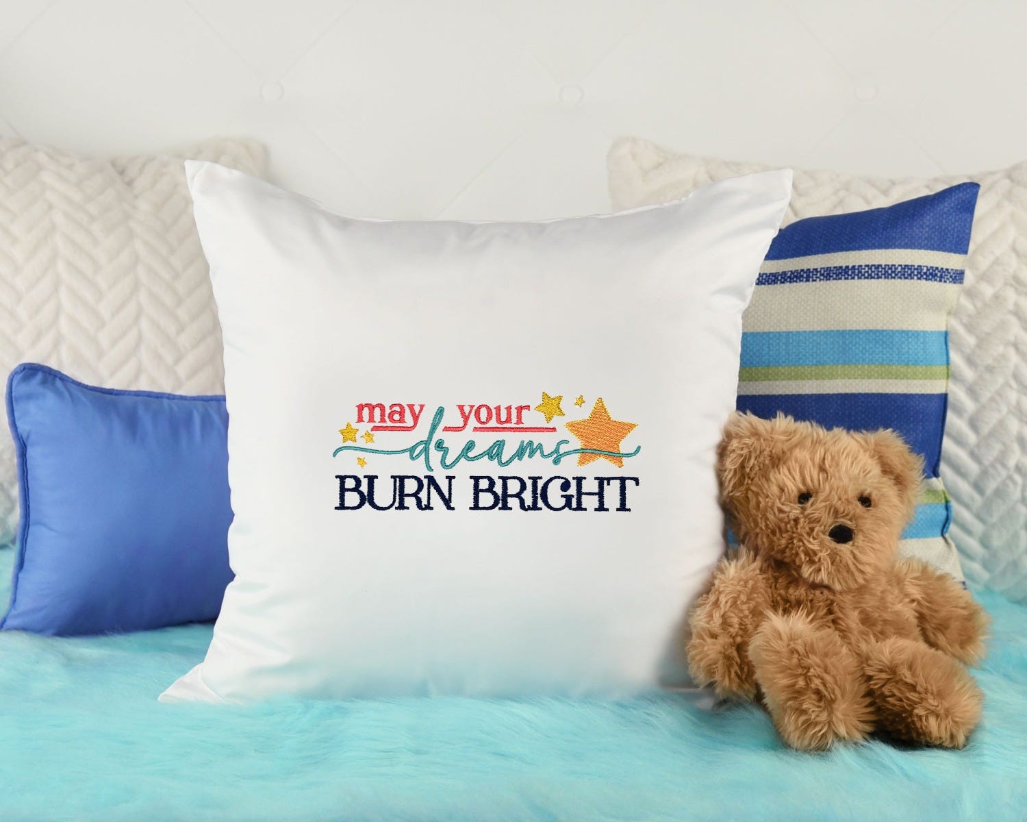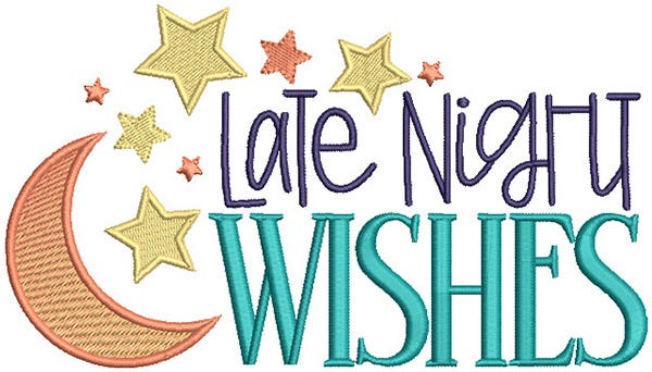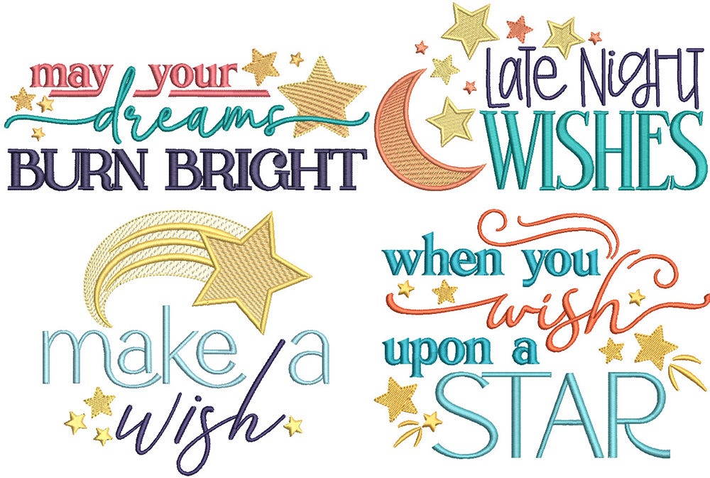 4 sweet word art designs to send nighttime starry wishes! Featuring satin stitch lettering with sketch and fill stitch details.