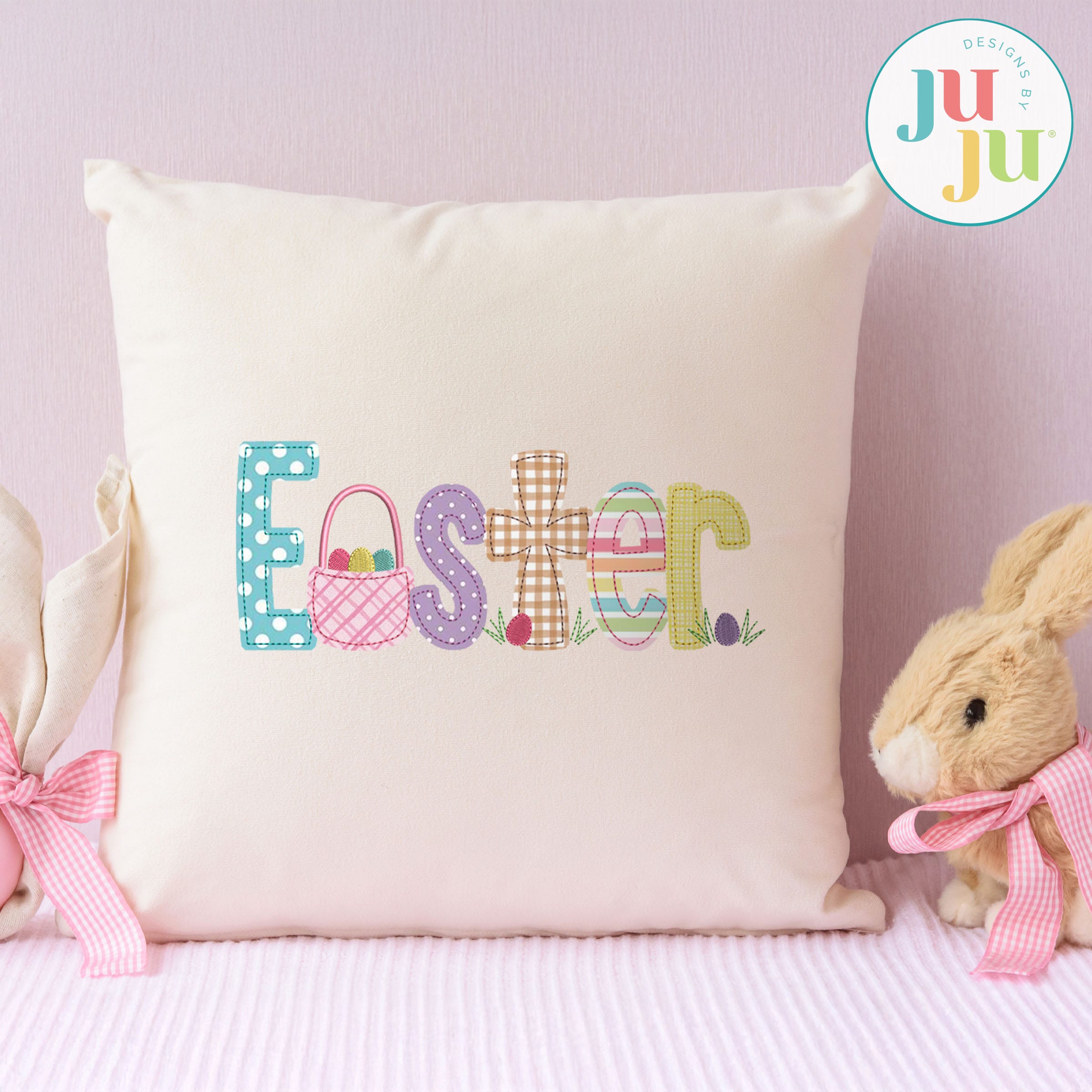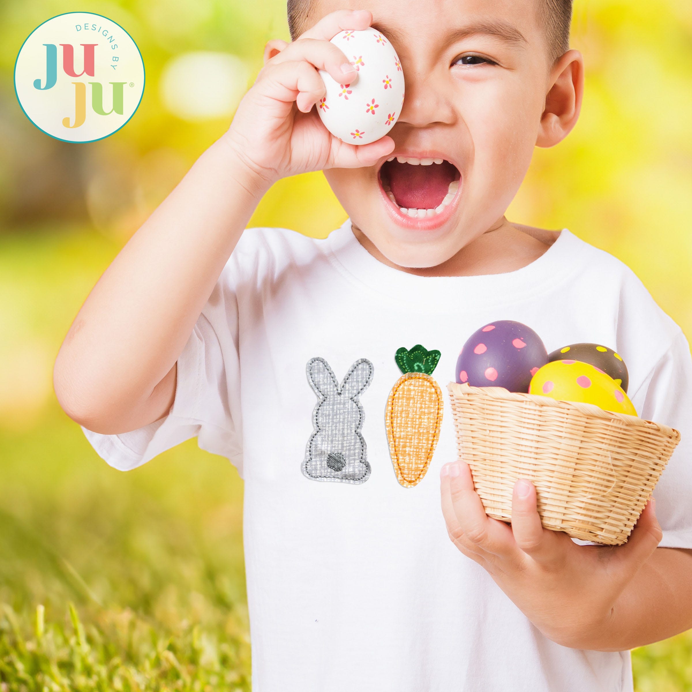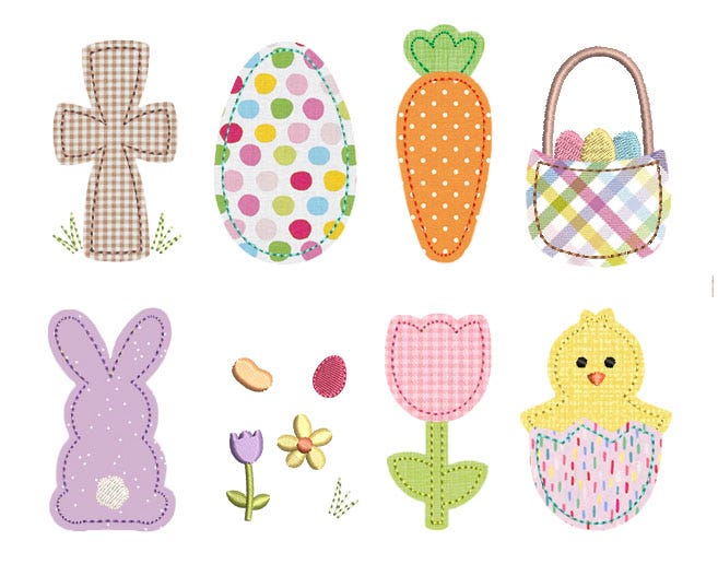 Easter Kit includes 7 appliques (basket, bunny carrot, chick, cross, egg, tulip) and 5 embroidery-only accents (mini daisy, mini egg, mini grass, mini jelly bean, mini tulip).