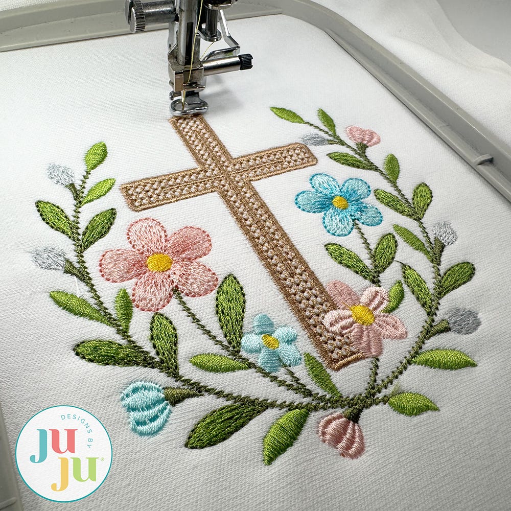 Remember the reason for the Easter season with our Easter Laurel Cross design! This single, embroidery-only design features a beautiful floral laurel surrounding a cross, done in a gorgeous variety of embroidery stitch types for a lovely textural look.