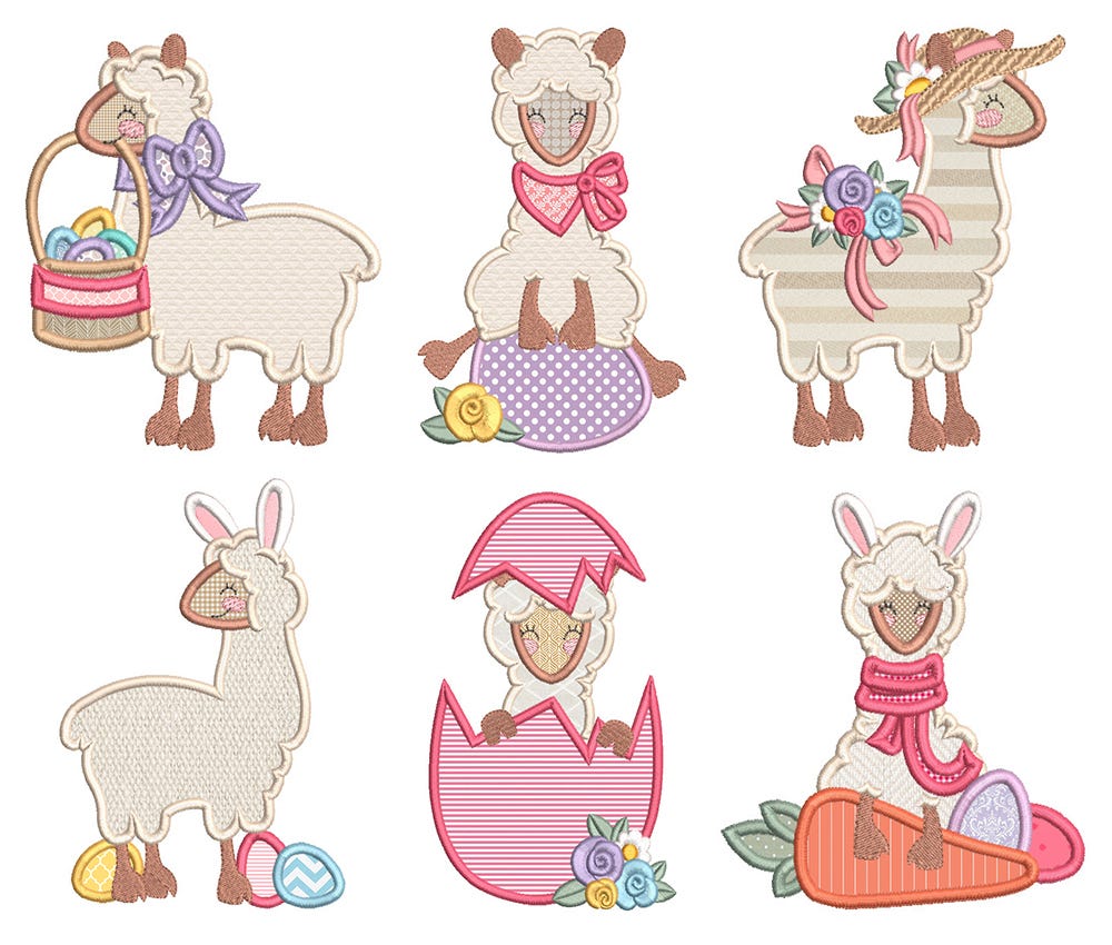 6 adorable llamas decked out for Easter! What a hoot! These are applique designs.