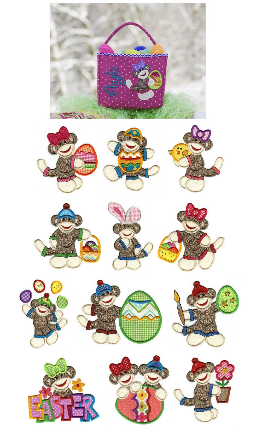 12 super adorable applique sock monkeys in an Easter theme..perfect for Spring!Ā