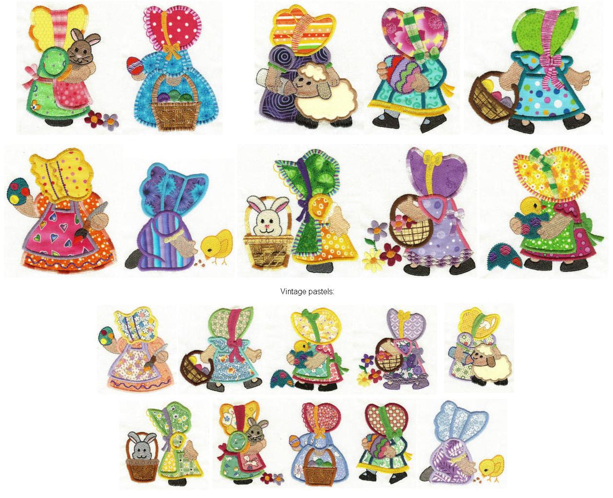 Here is a set of precious sunbonnets in an Easter theme. Make them super bright, or use up your vintage pastels! A must have for sunbonnet collectors!