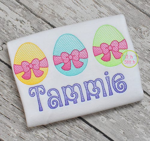 The light and airy "sketch" fill pattern allows for a quick stitch out. The space between each line of stitching varies such that it is more dense at the bottom of the object than top to create the shading effect. The objects are finished off with a triple bean stitch outline.
