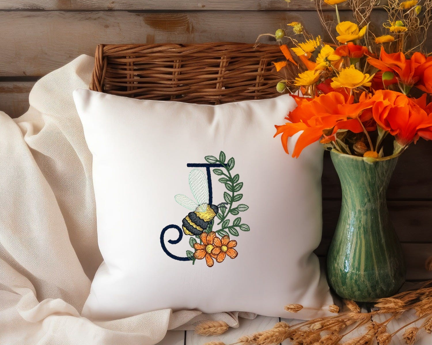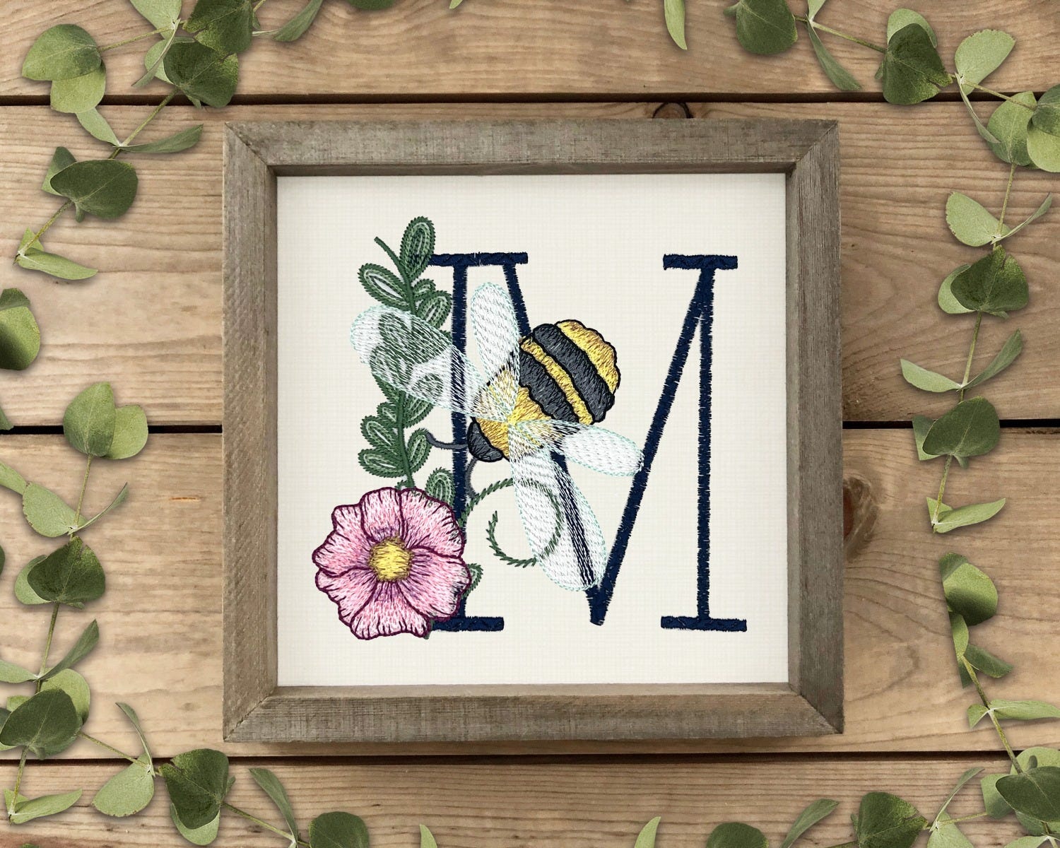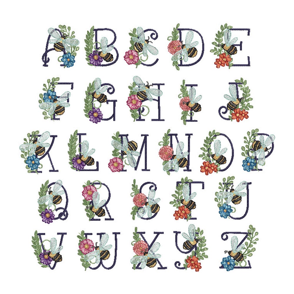 Add elegance to your project with our Bee Alphabet, available in 4 sizes (3-inch, 4-inch, 5-inch and 6-inch). This alphabet is embroidery-only: each decorative fill stitch letter has a bee with light sketch fill wings and a flower that features multiple color layers of lighter density fill to create a blended, variegated, textured look. There is one file per letter, as pictured.