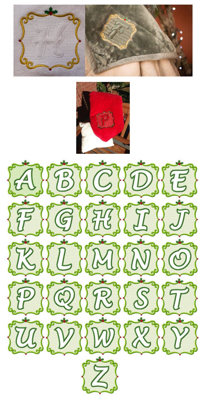 This is a beautiful embossed monogram perfect for elegant Christmas items with it's pretty scrolled frame and holly leaves. I love to stitch it using metallic thread for the frame and tone on tone for the letter. So pretty!