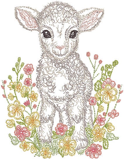 A precious lamb has bounced through the flowers to wish you a Happy Easter! This design is perfect for vintage spring